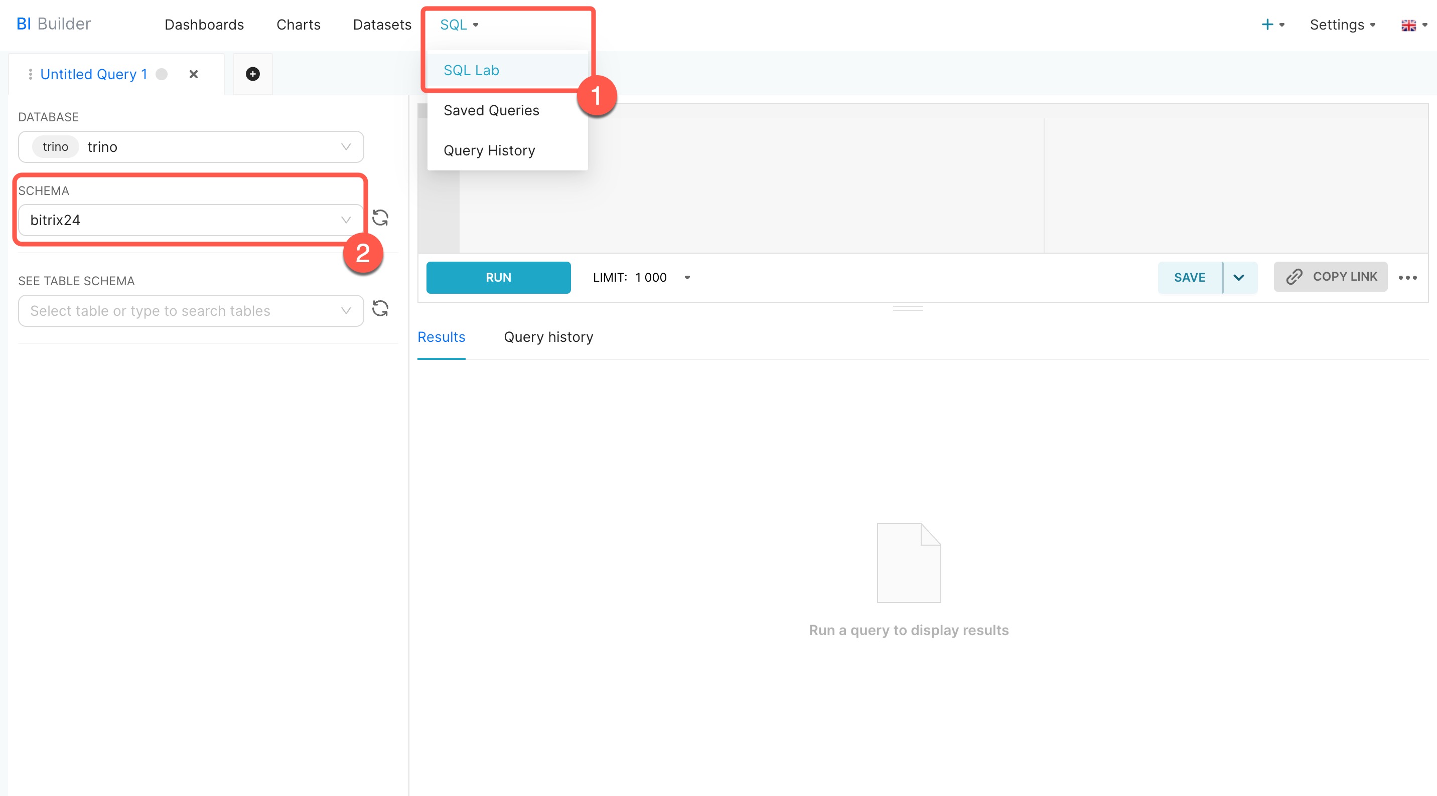 - Abre el BI Builder y ve a la sección SQL > SQL Lab.