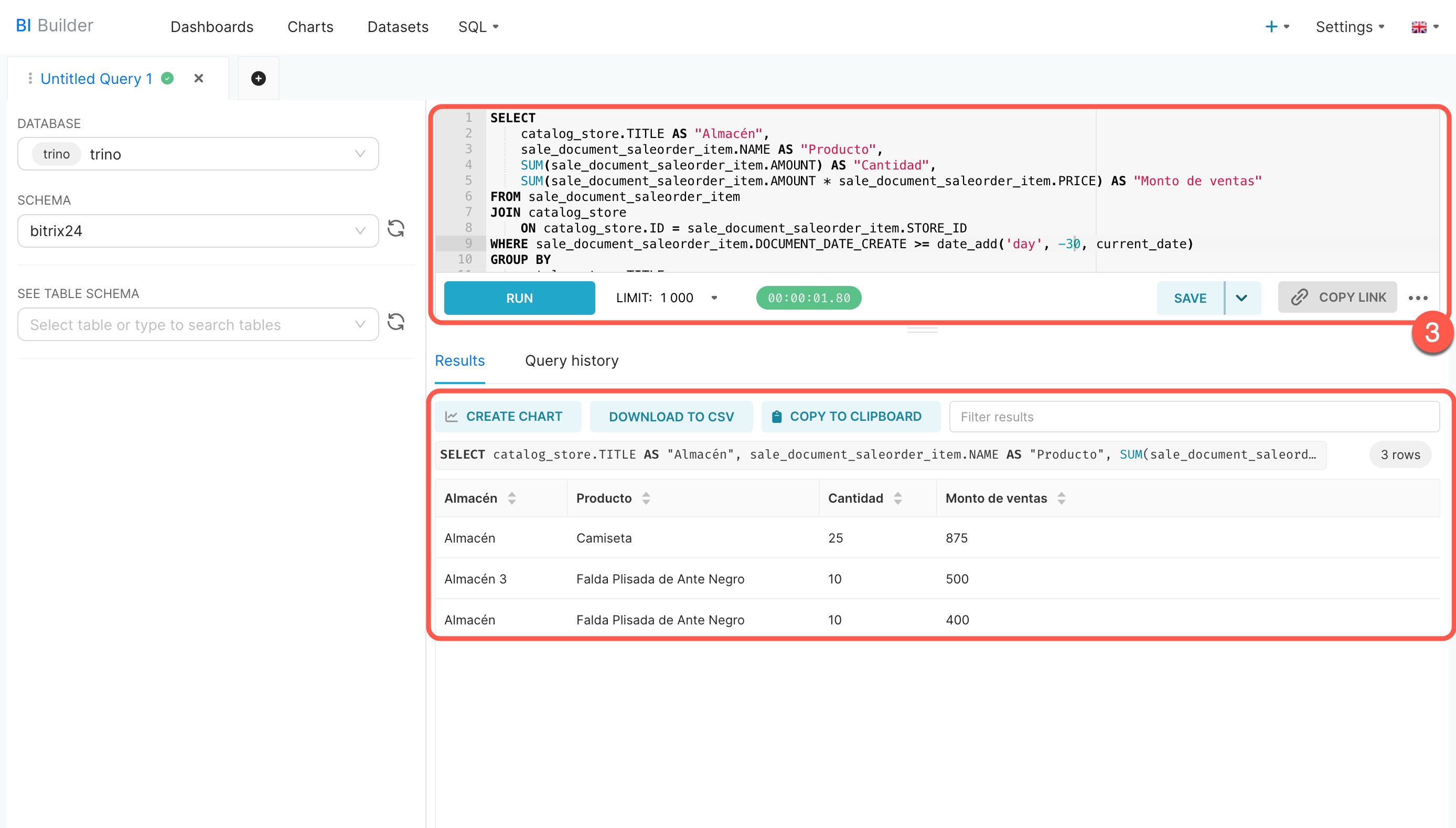 Hemos escrito una consulta SQL para extraer datos de dos conjuntos: detalle de la orden de venta (sale_document_saleorder_item) y la lista de almacenes (catalog_store). La consulta mostrará desde qué almacén se vendieron los productos, qué productos se vendieron, en qué cantidad y por qué monto.