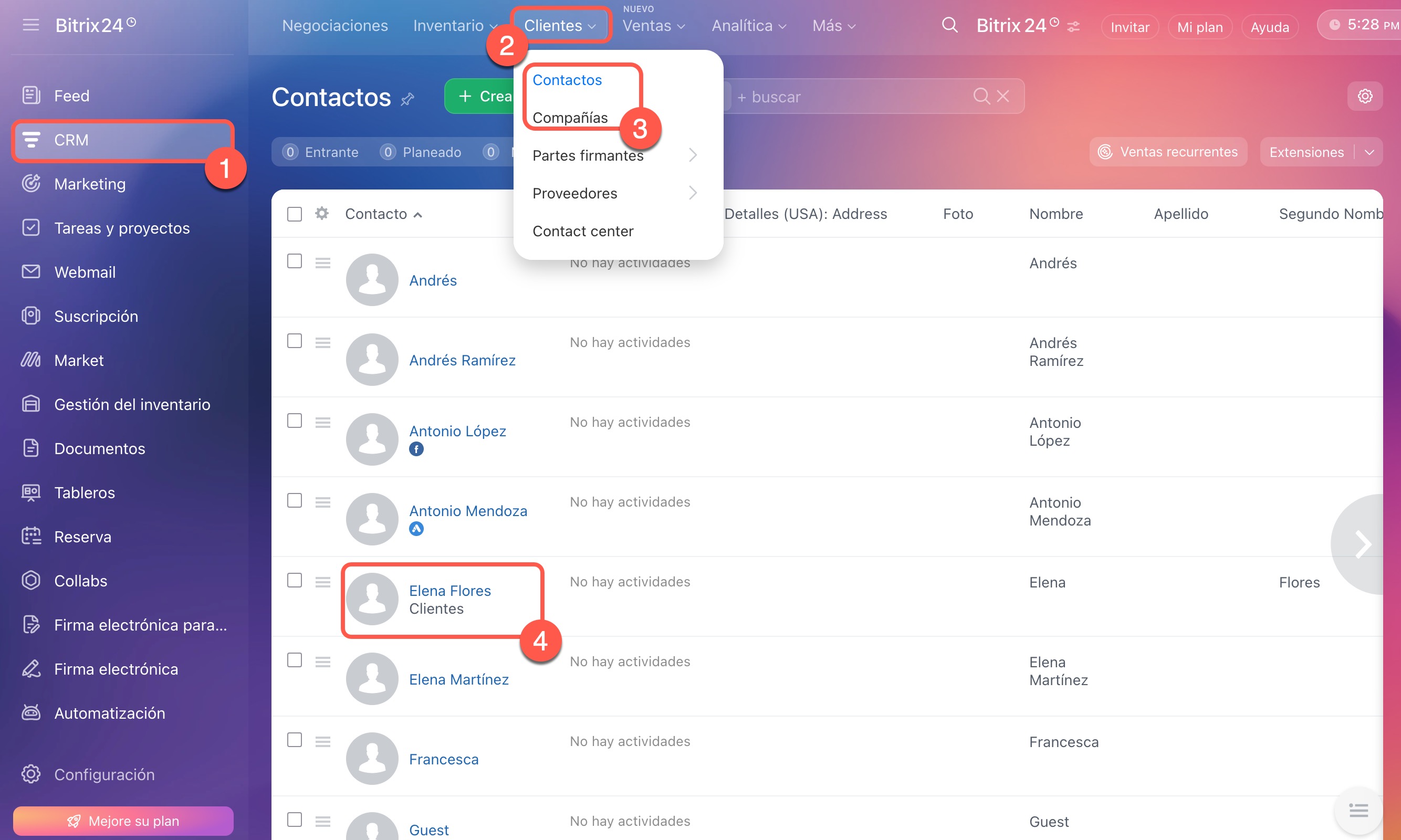 1–4. Ve a CRM > Clientes > Contactos o Compañías y abre la ficha que necesites.