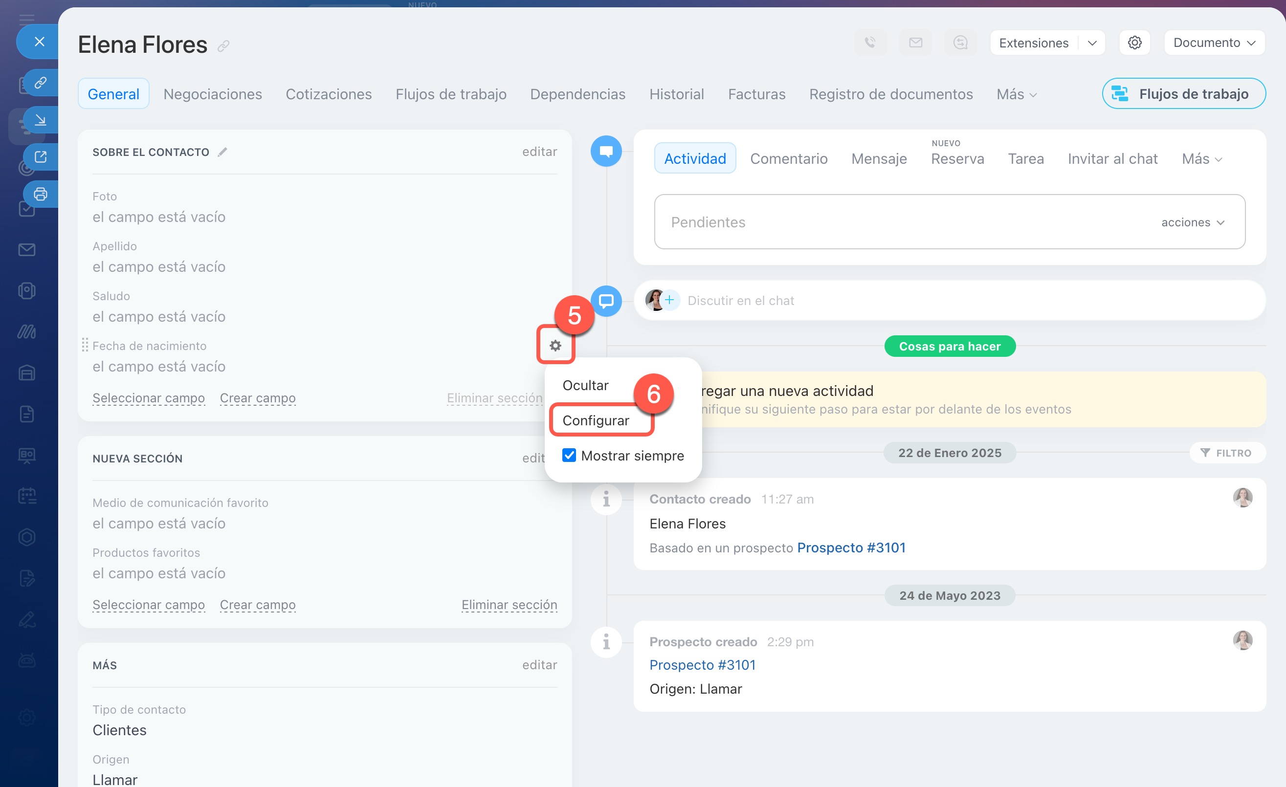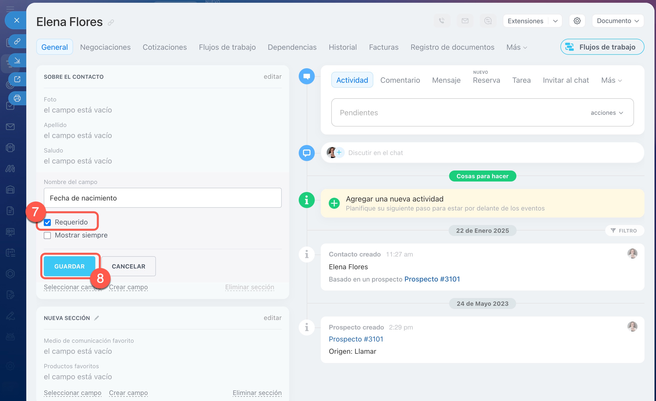 Los campos obligatorios ayudan a no olvidar información importante que debe ingresarse en la ficha del CRM. Por ejemplo, el correo electrónico del cliente o la dirección de entrega.