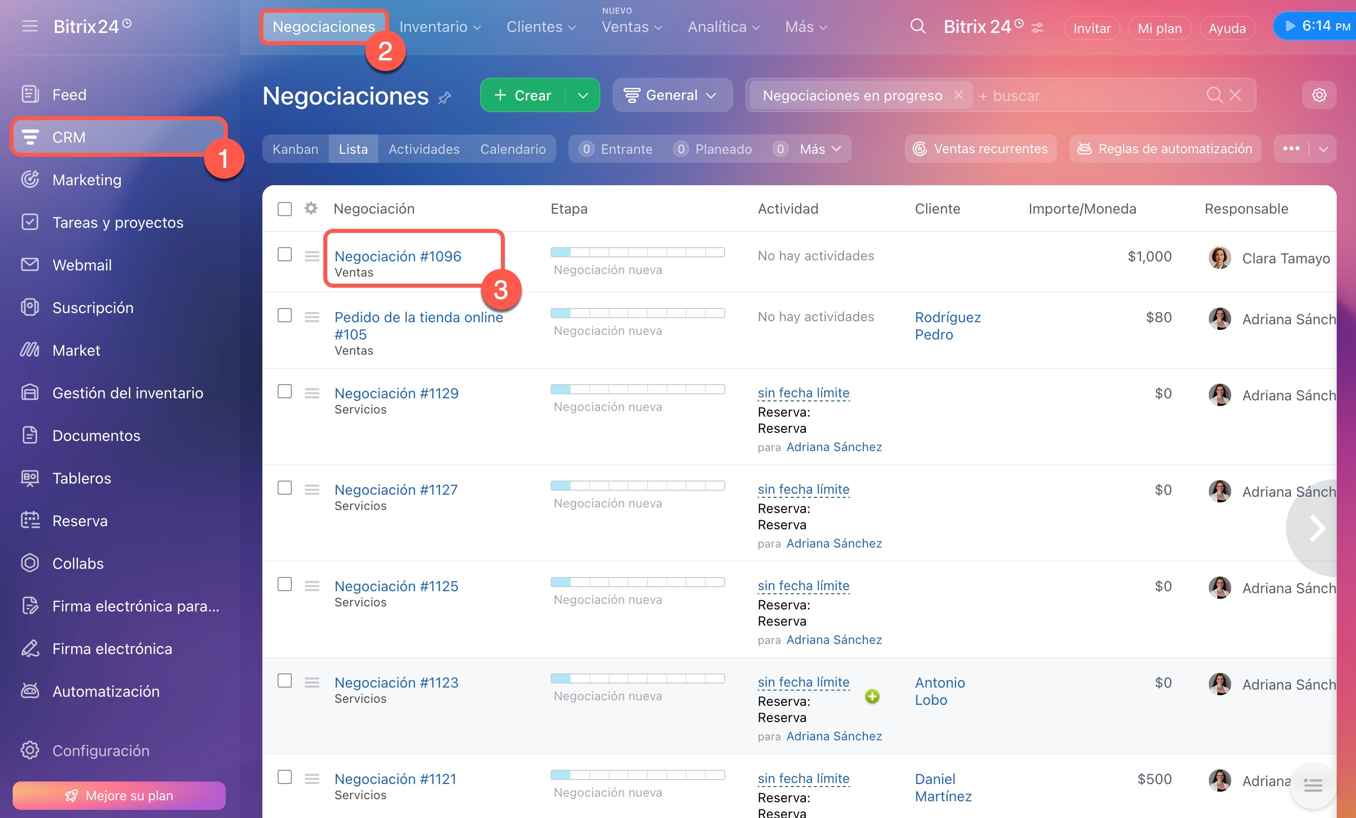 1–3. Ve a CRM > Negociaciones y abre la ficha que necesites.