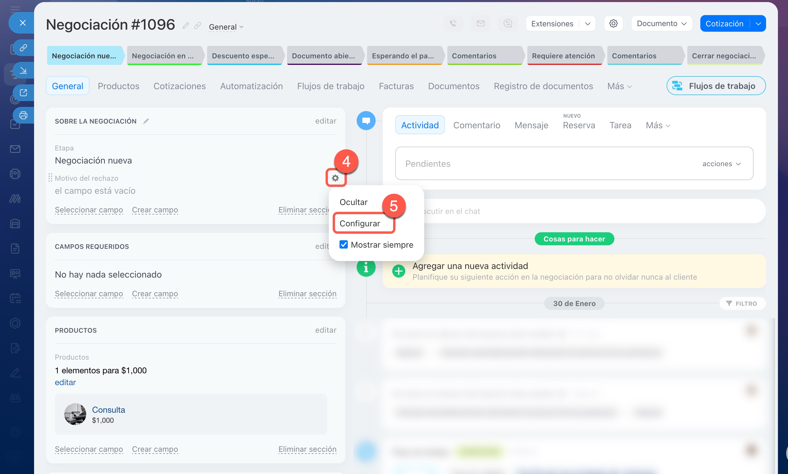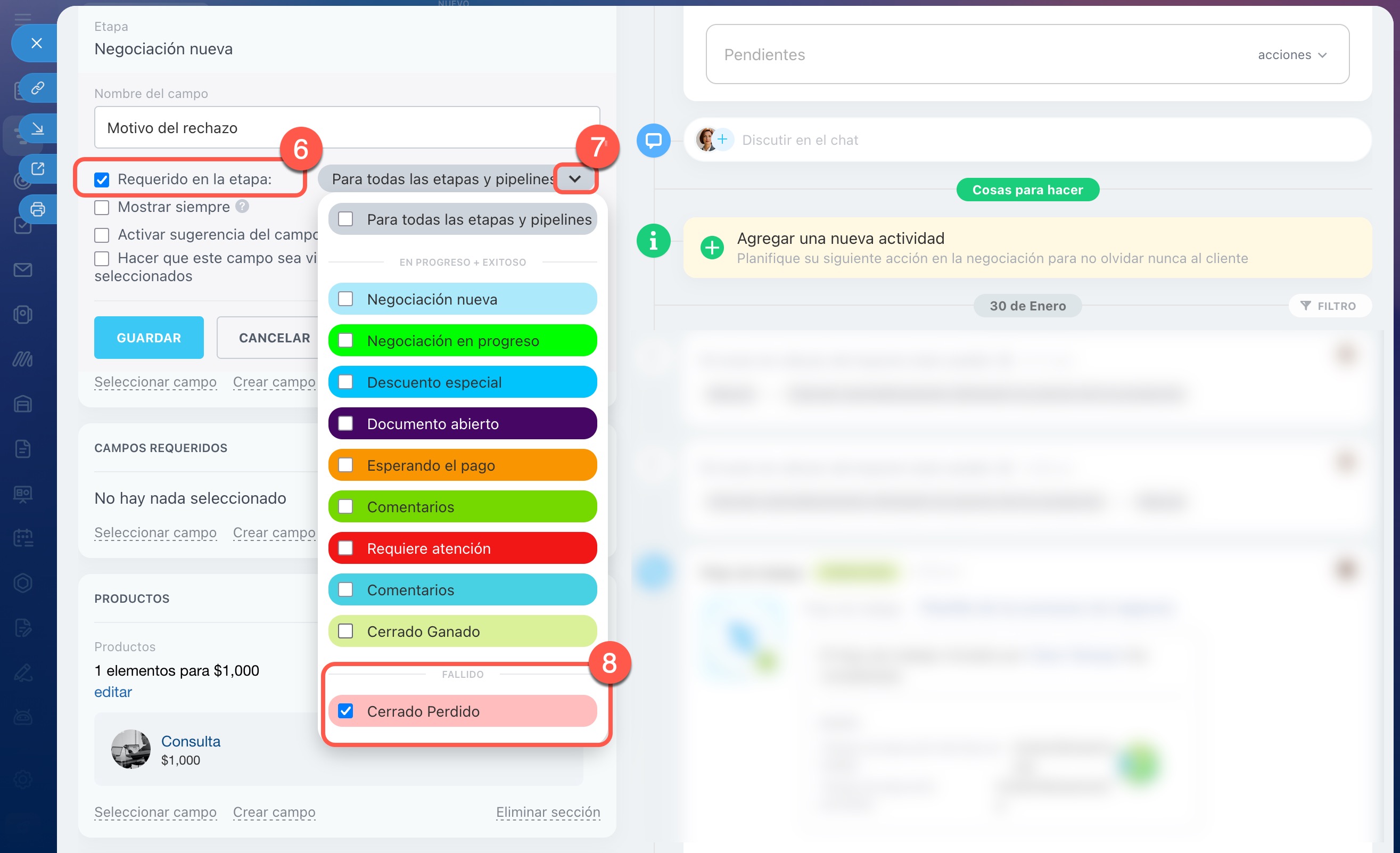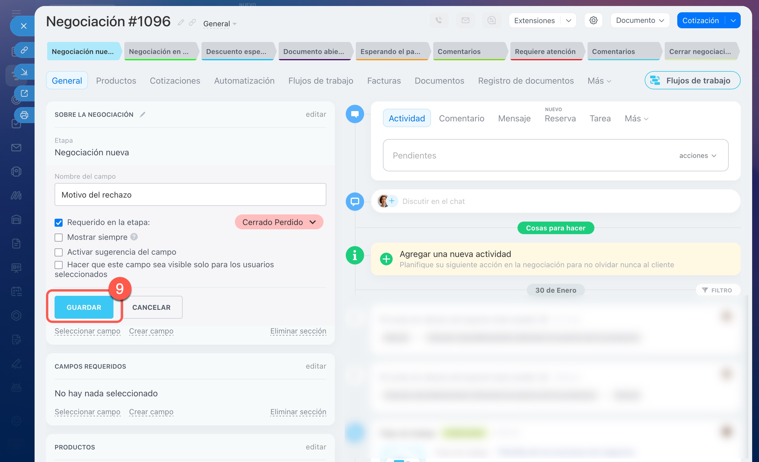 En prospectos, negociaciones, facturas, cotizaciones y procesos inteligentes, puedes configurar campos obligatorios para todas las etapas o solo para algunas específicas. Por ejemplo, si en una negociación haces que el campo Fuente sea obligatorio para la etapa En proceso, el gerente no podrá mover la ficha a esta etapa hasta que indique la fuente.