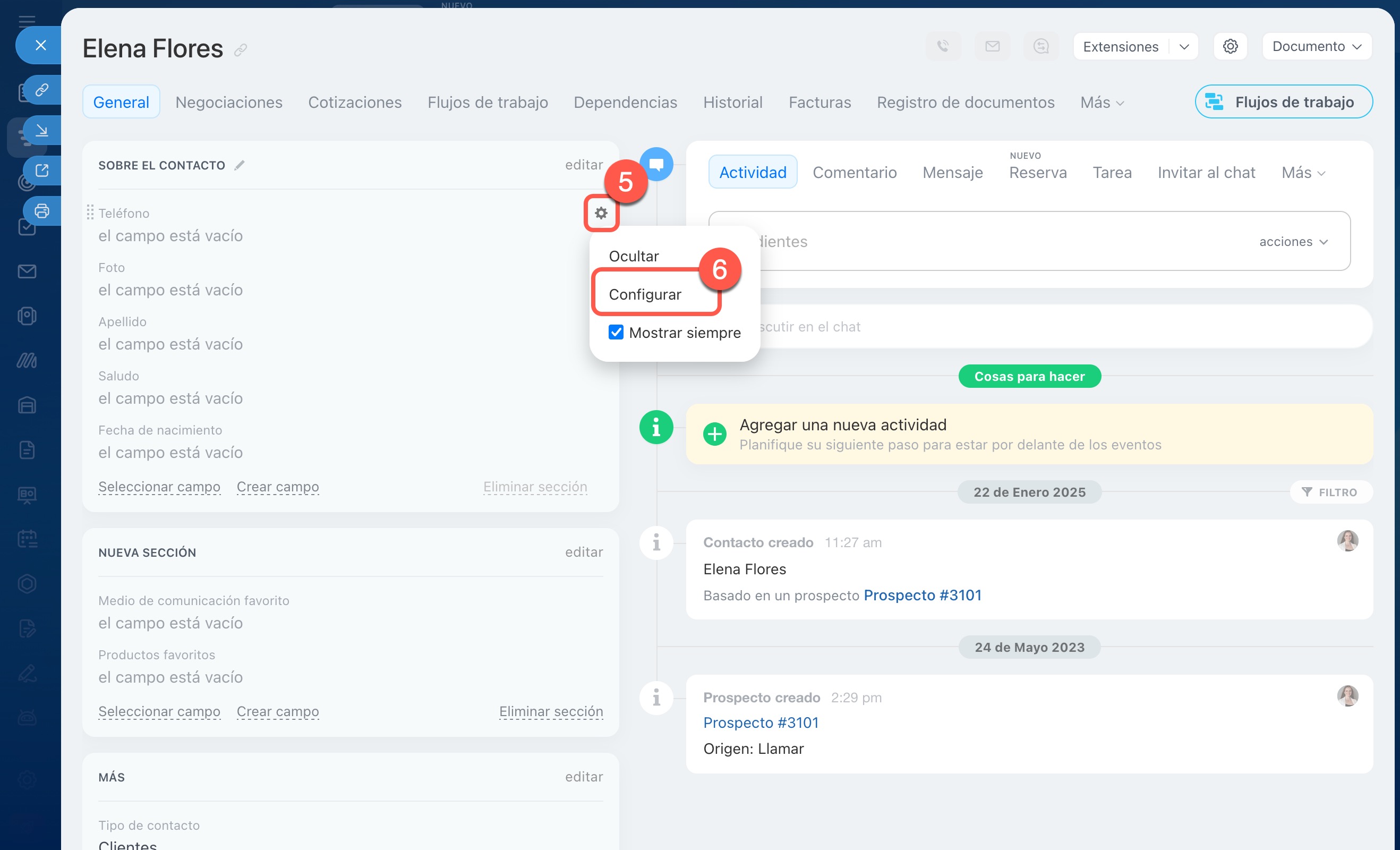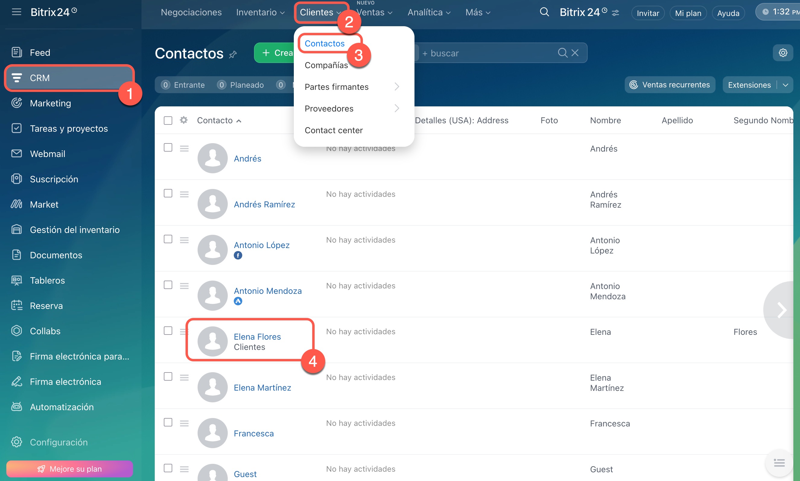 1–4. Ve a CRM > Clientes > Contactos o Compañías y abre la ficha necesaria.
