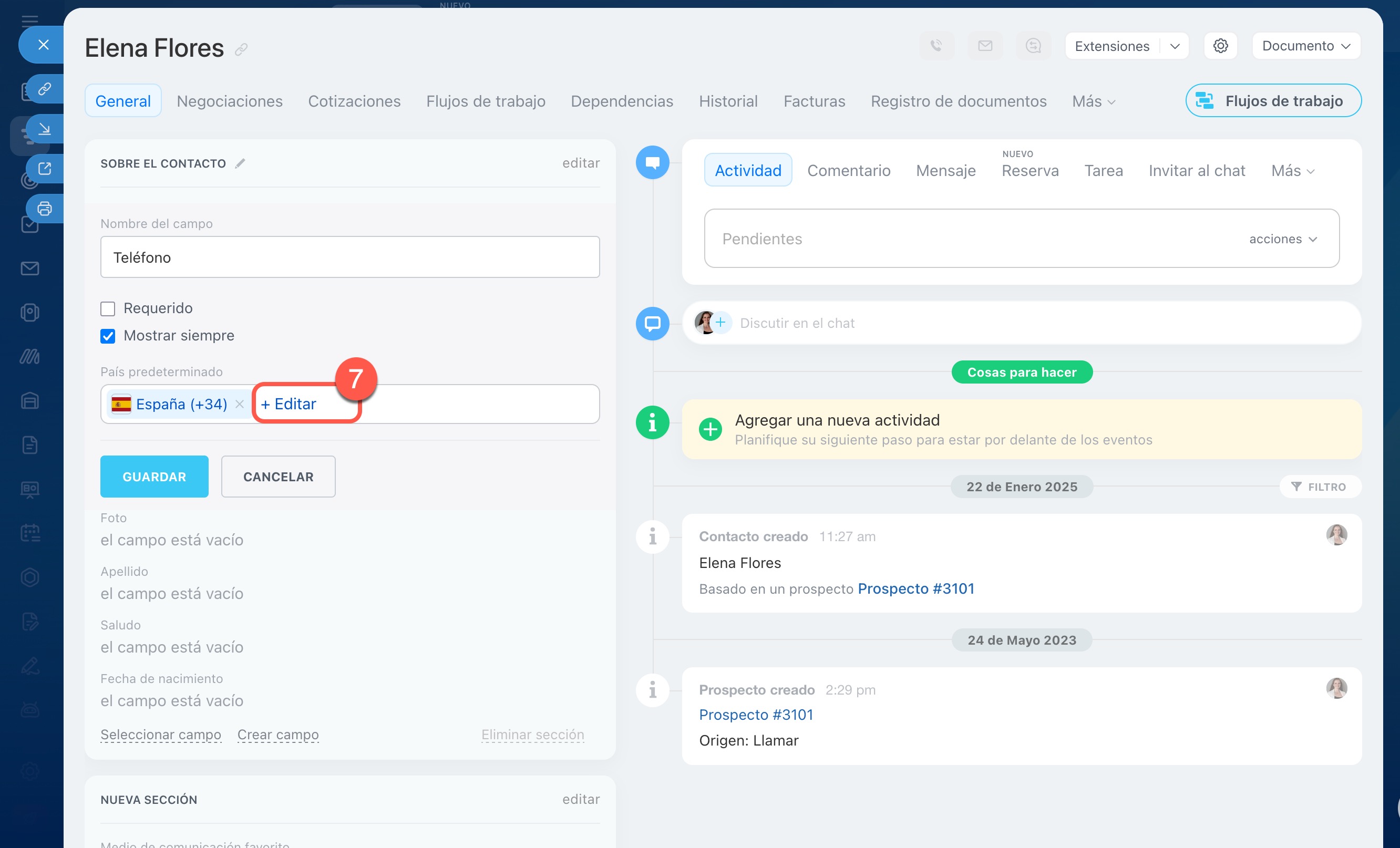 - Si trabajas raramente con clientes extranjeros, no es necesario cambiar el país por defecto; puedes seleccionar el código haciendo clic en la bandera directamente en el campo Teléfono de la ficha.