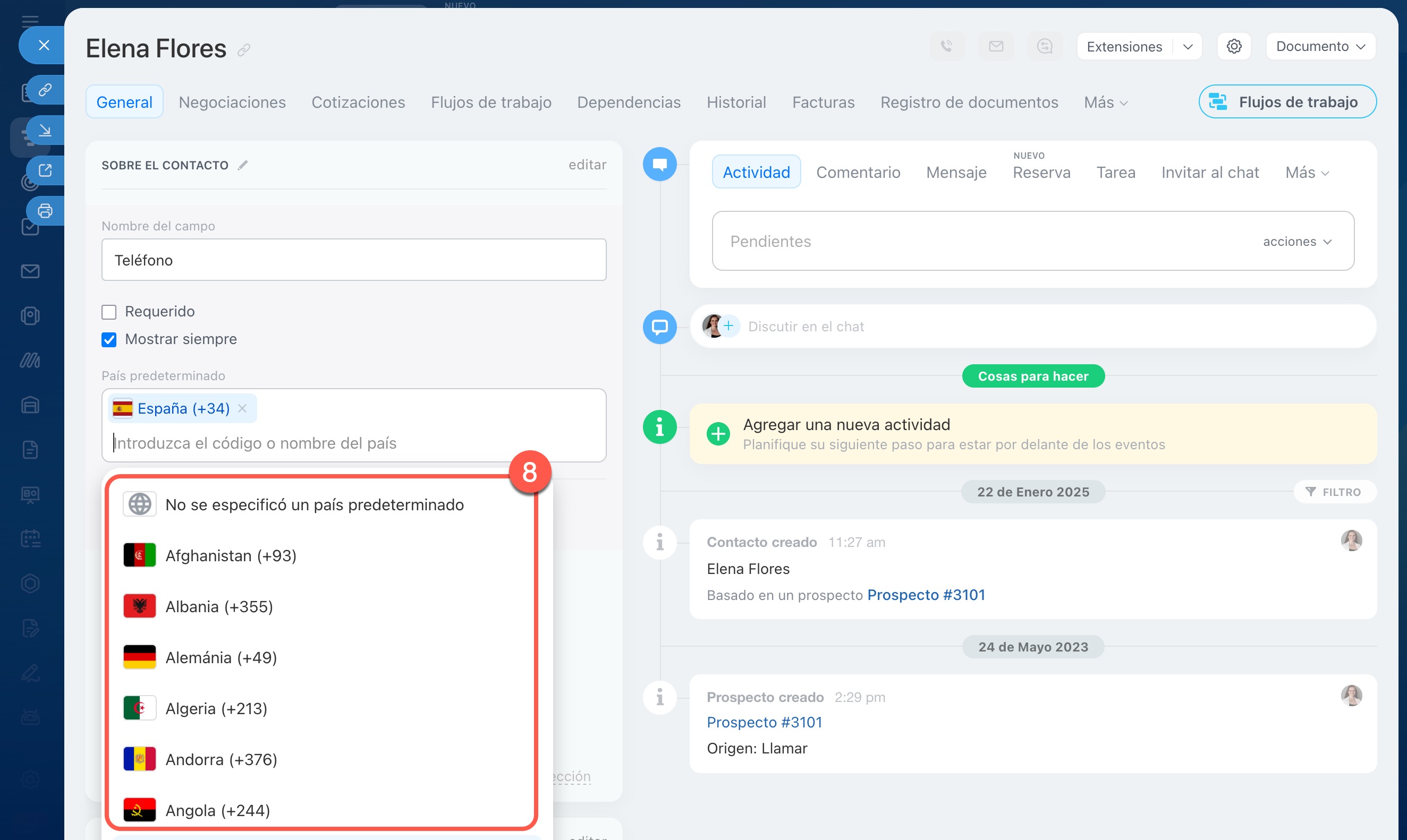 - En las fichas de contactos y compañías hay un campo Teléfono. En él se completa automáticamente el código del país, que por defecto se determina según el dominio de tu Bitrix24.