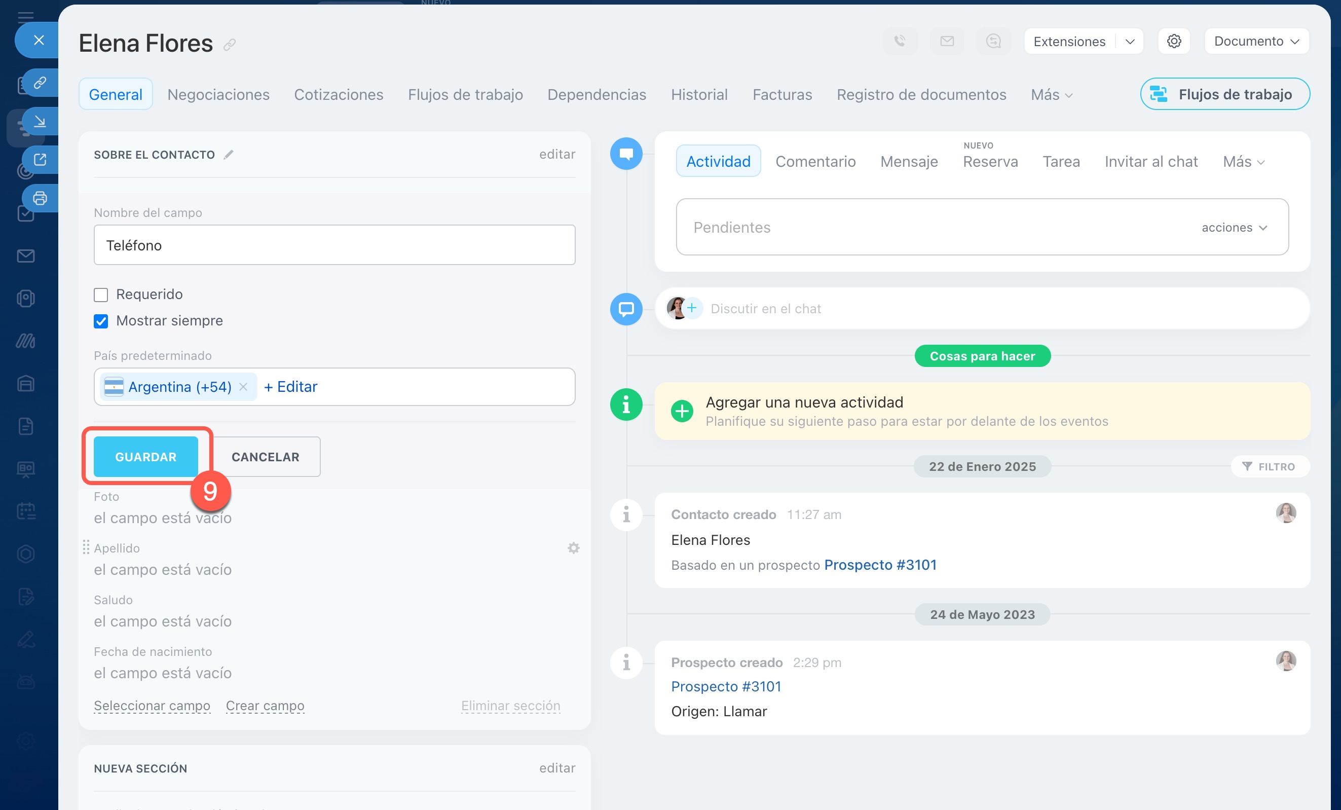 En las fichas de contactos y compañías hay un campo Teléfono. En él se almacena el número de teléfono del cliente para llamarlo fácilmente. El código del país se completa automáticamente; no necesitas ingresarlo manualmente.