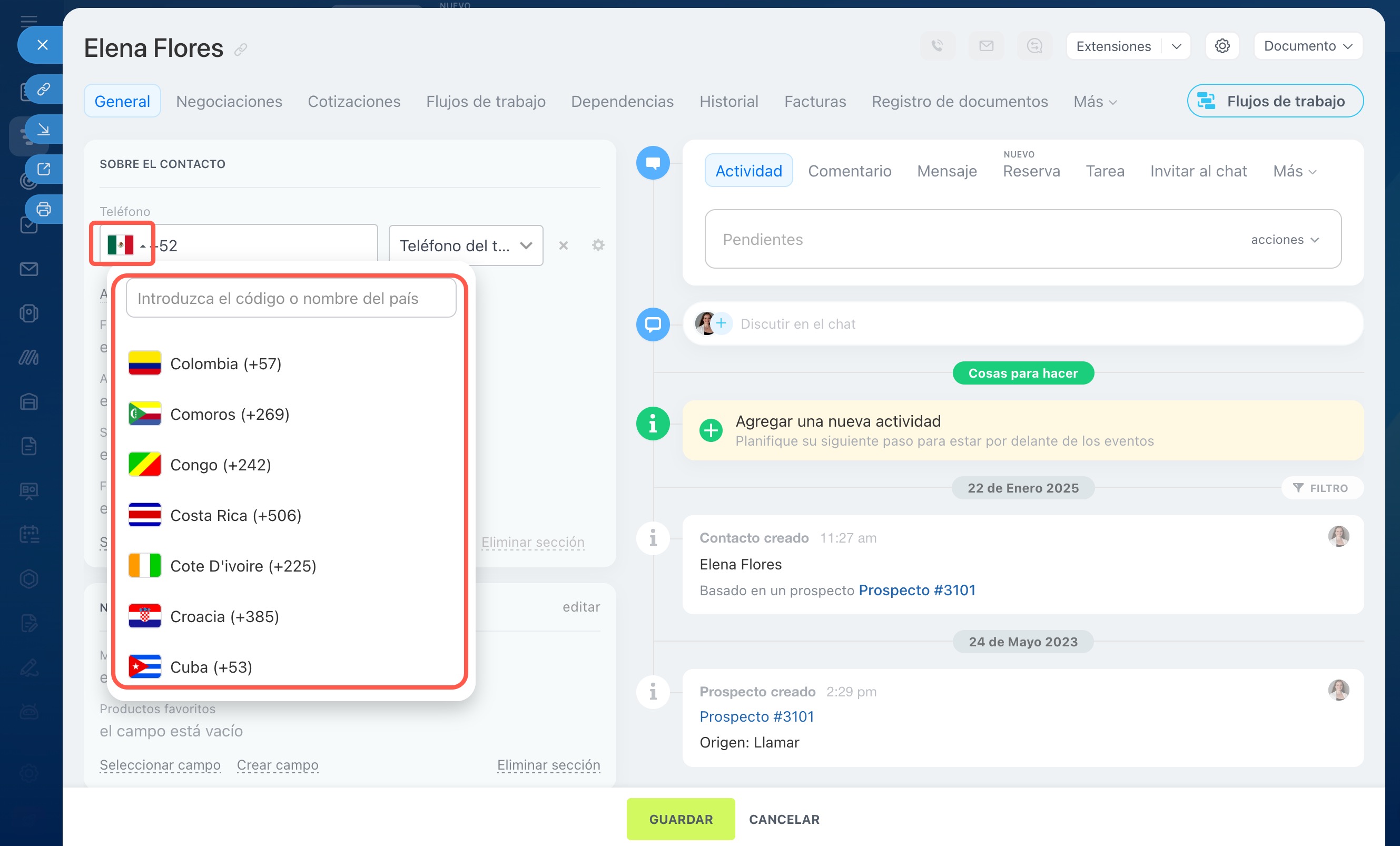Si trabajas raramente con clientes extranjeros, no necesitas cambiar el código del país por defecto; puedes seleccionarlo en la ficha de un cliente específico. Por ejemplo, si haces negocios en México y uno de tus clientes está en Colombia. Para encontrar el código del país necesario, haz clic en la bandera en el campo Teléfono y selecciona una opción de la lista. El código seleccionado aparecerá solo en la ficha de ese cliente.