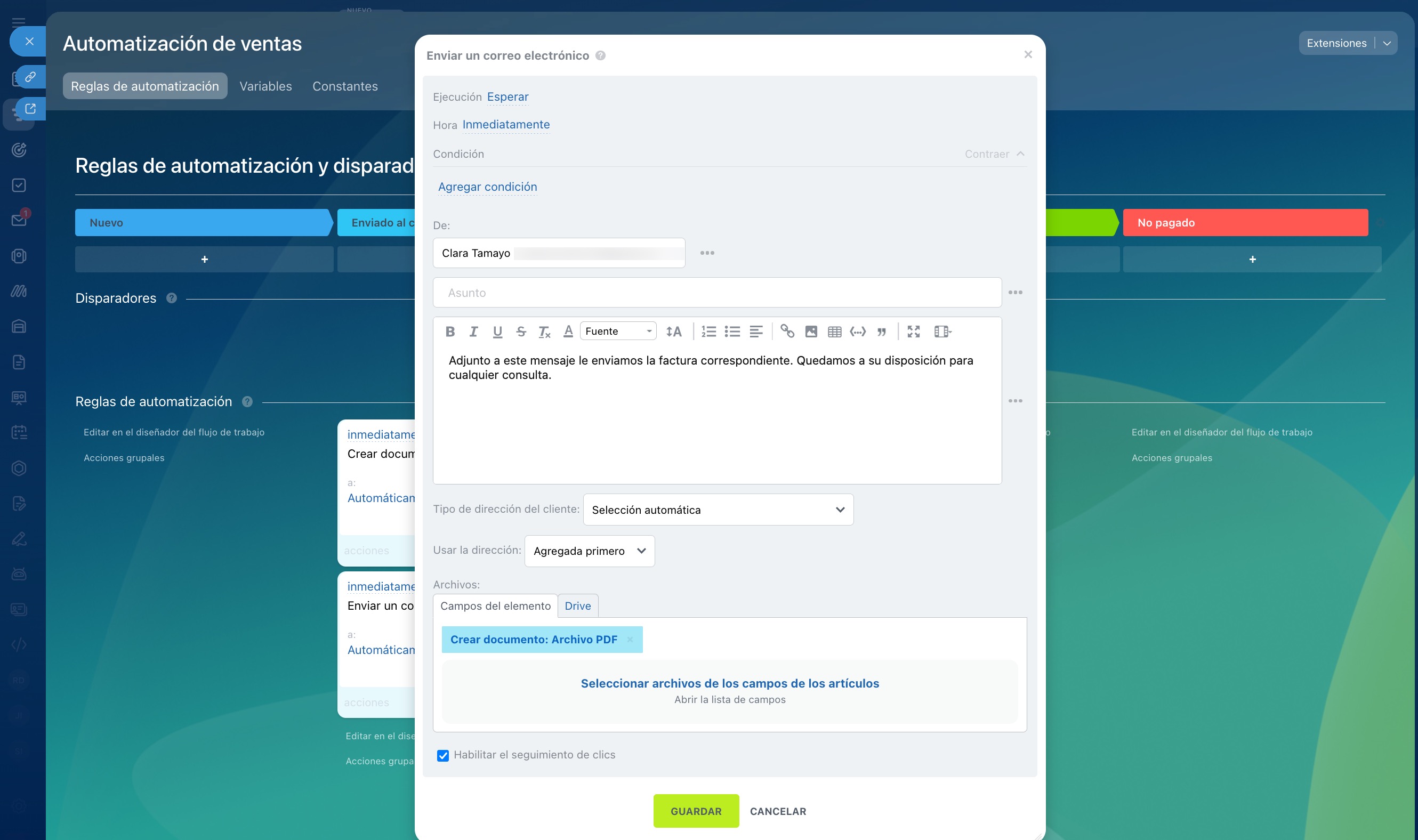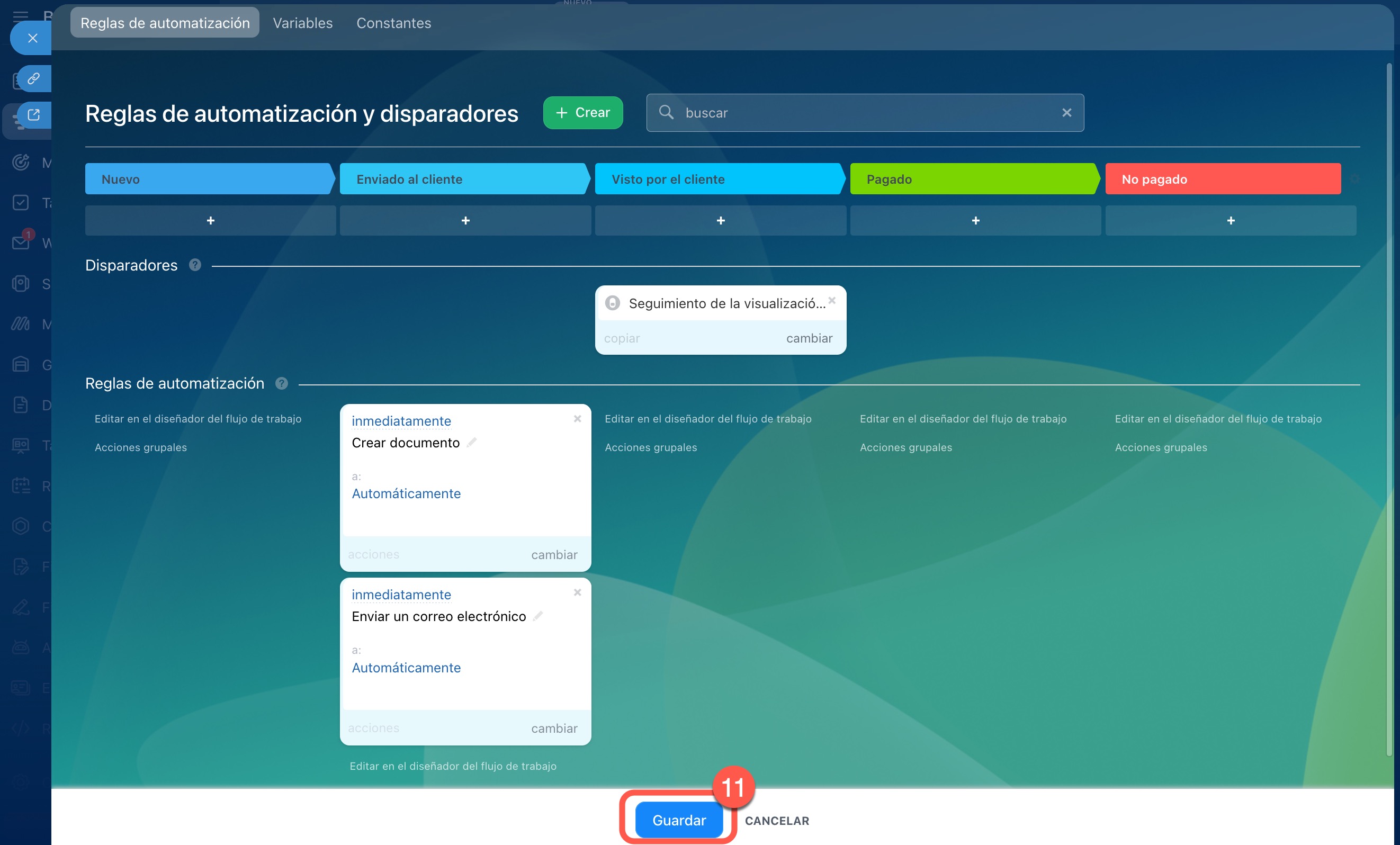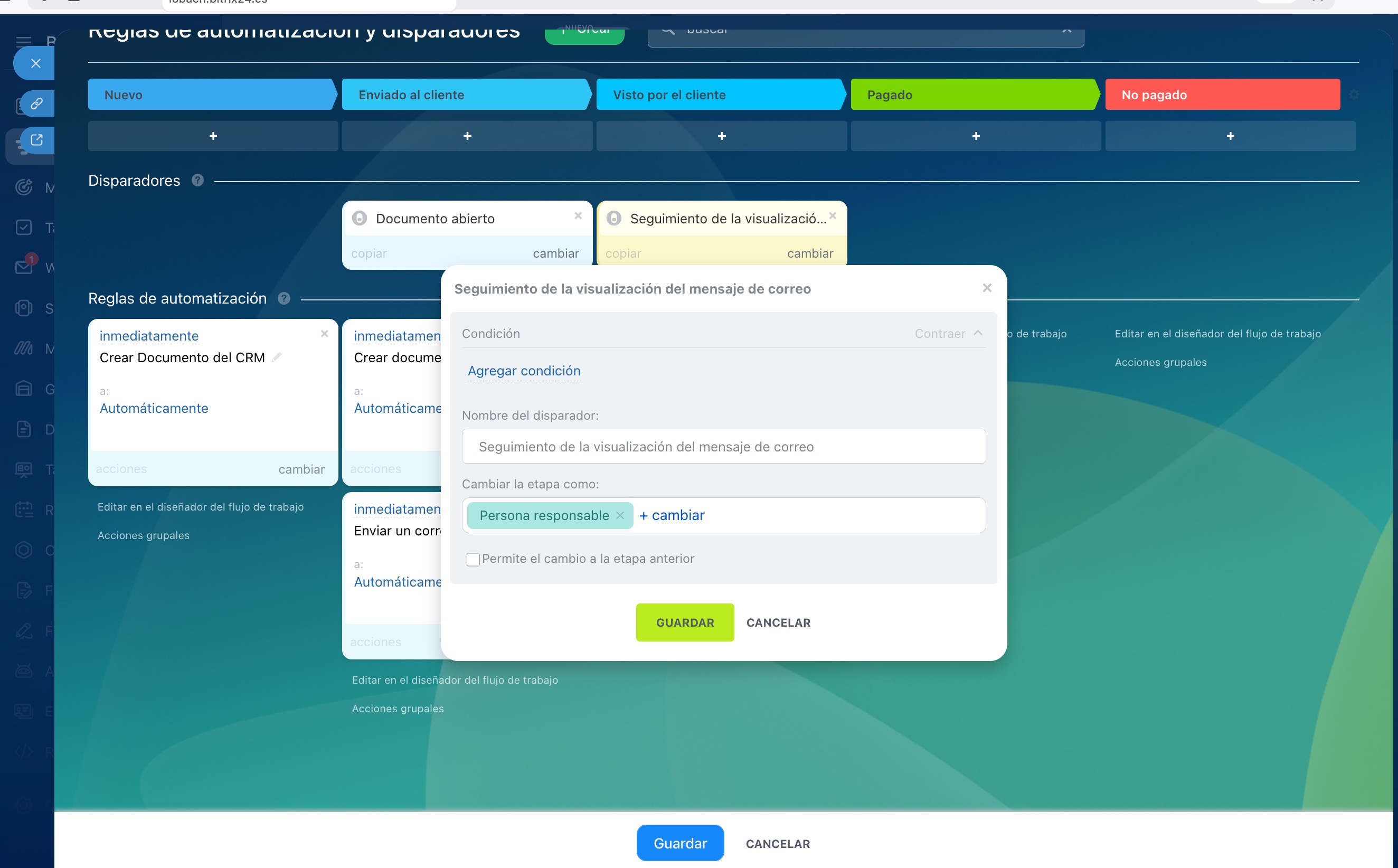 Reglas de automatización y disparadores configurados en las etapas "Enviado al cliente" y "Visto por el cliente"