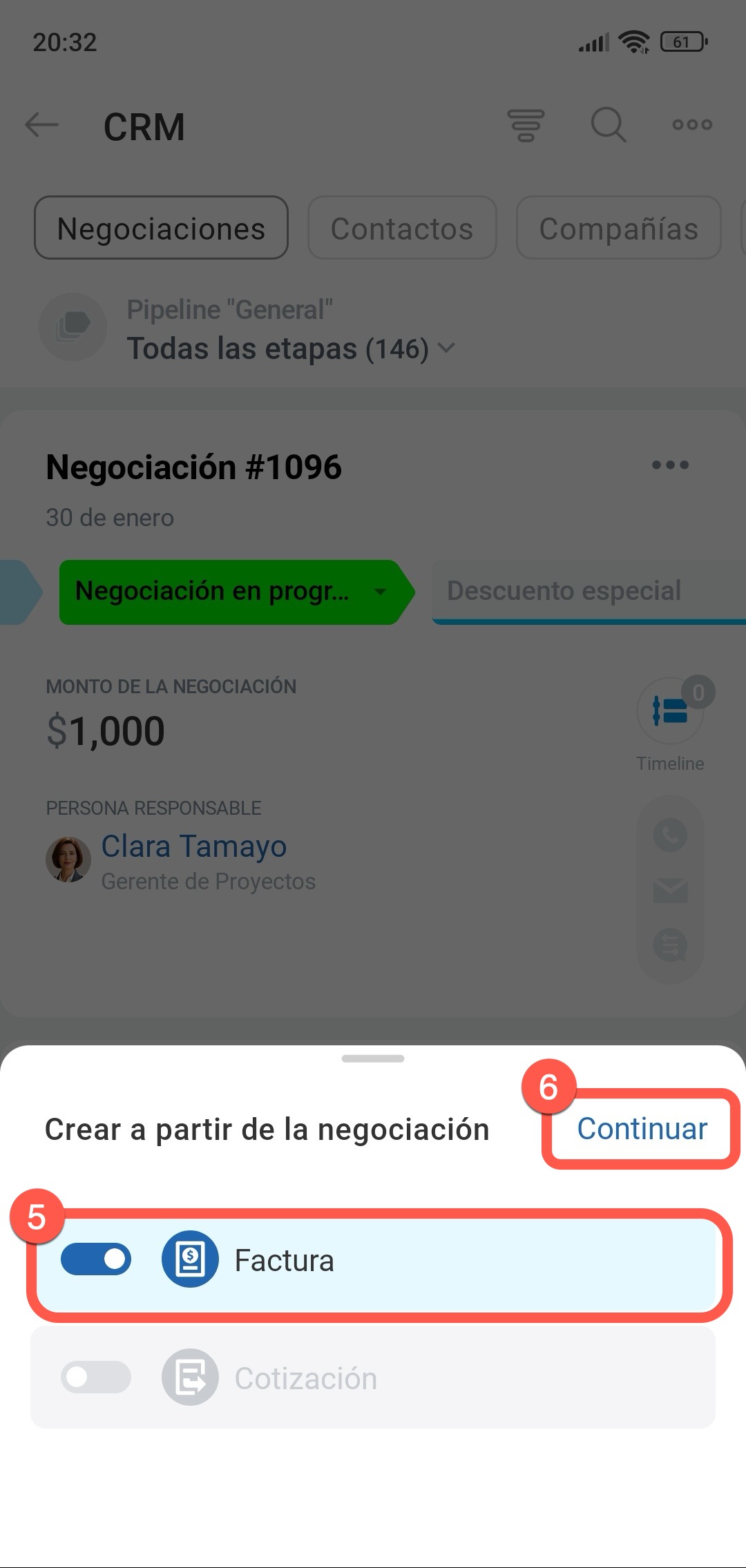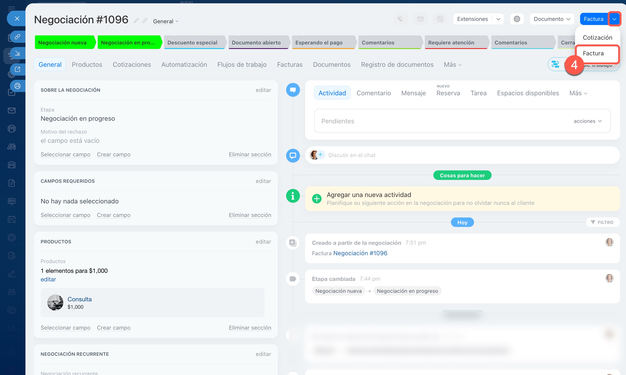 Desde la ficha de una negociación o cotización. Este método es adecuado si estás gestionando una negociación y deseas emitir una factura inmediatamente después de llegar a un acuerdo con el cliente. Por ejemplo, después de una llamada, registraste el monto en la negociación y deseas emitir la factura de inmediato.