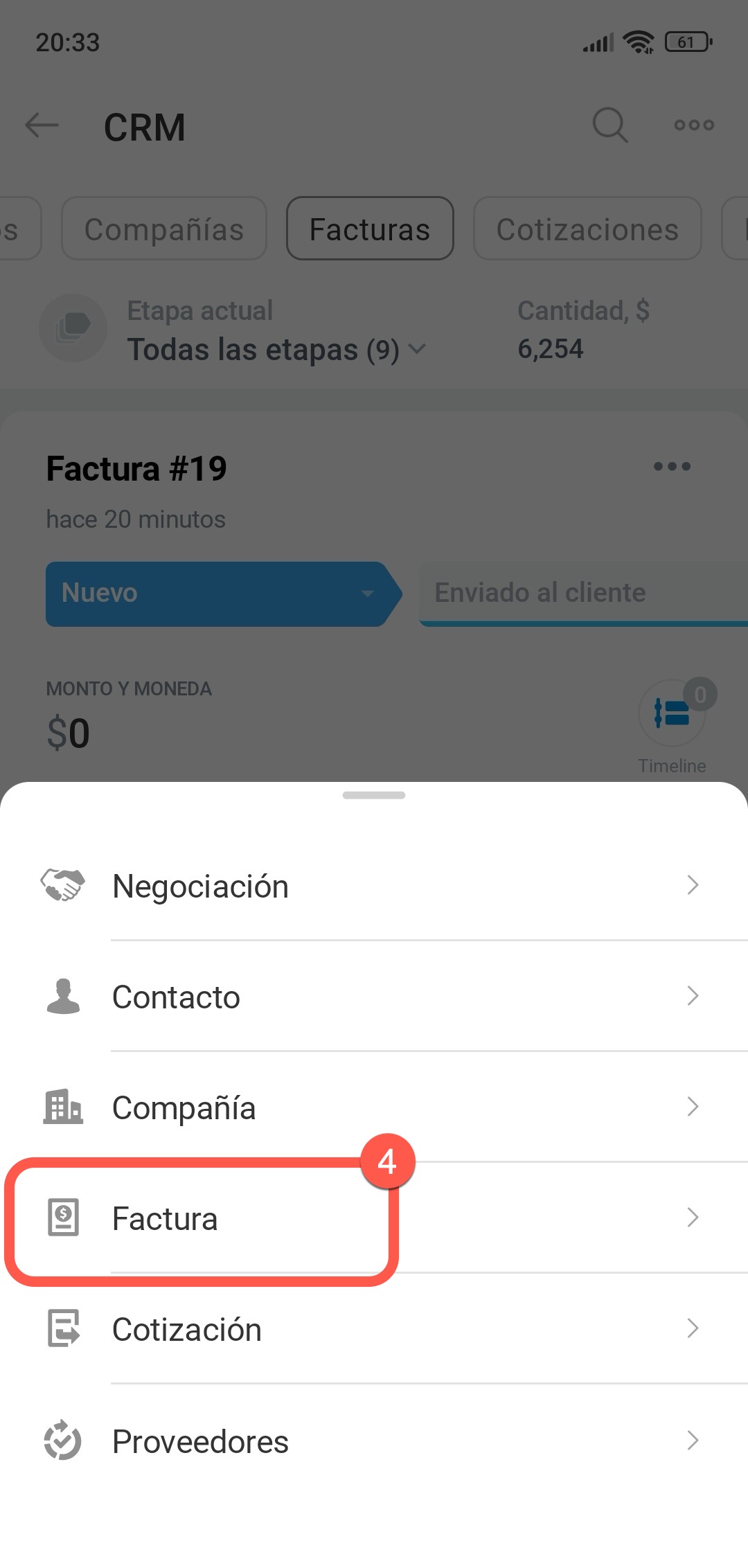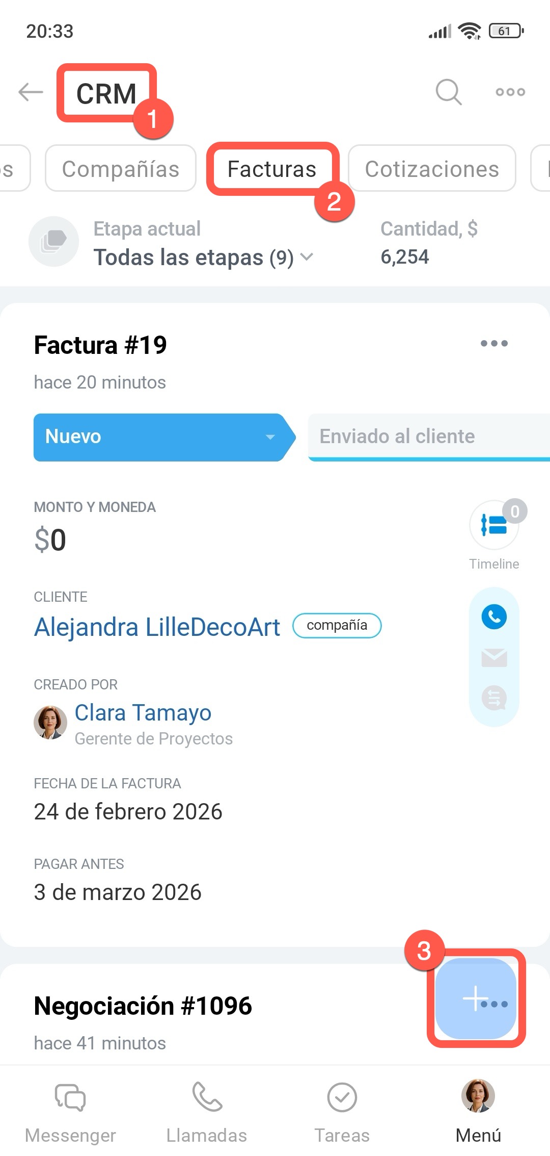 Desde la sección Facturas. Este método es adecuado si trabajas con la lista de facturas y deseas crear una nueva sin ir a la ficha de una negociación o cotización.