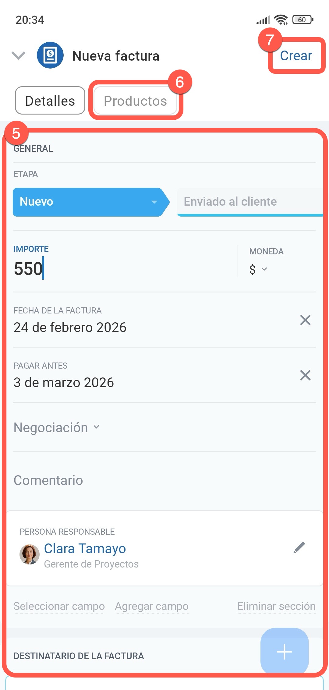 5–6. Completa los campos y añade productos.