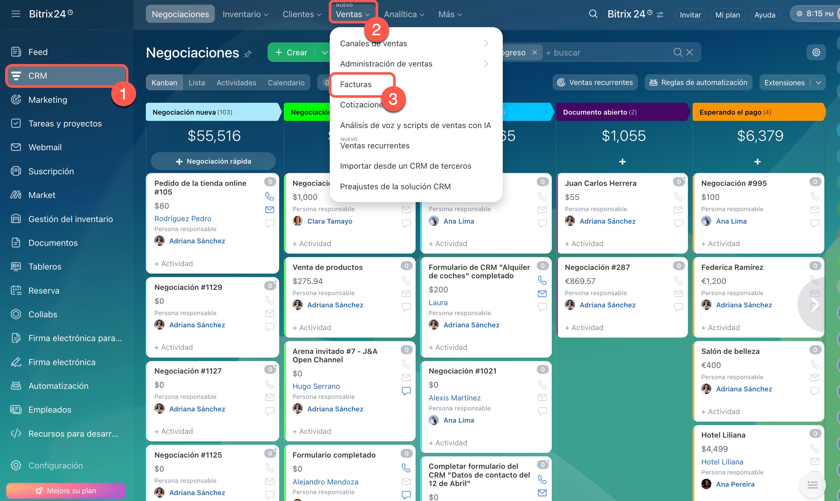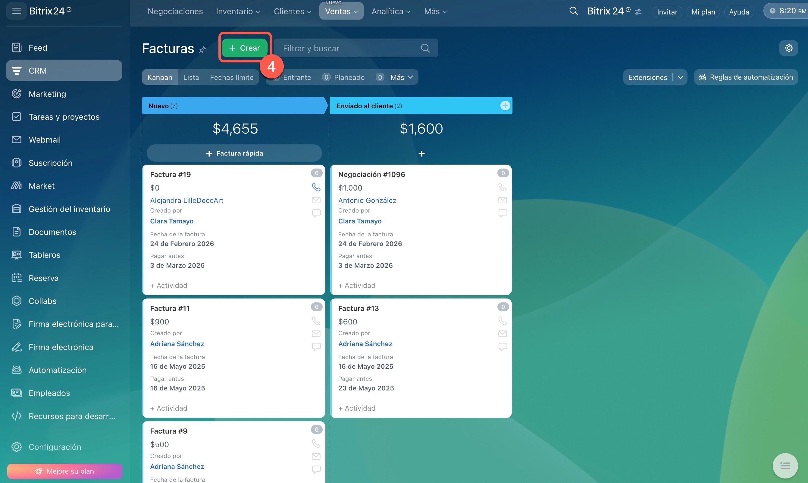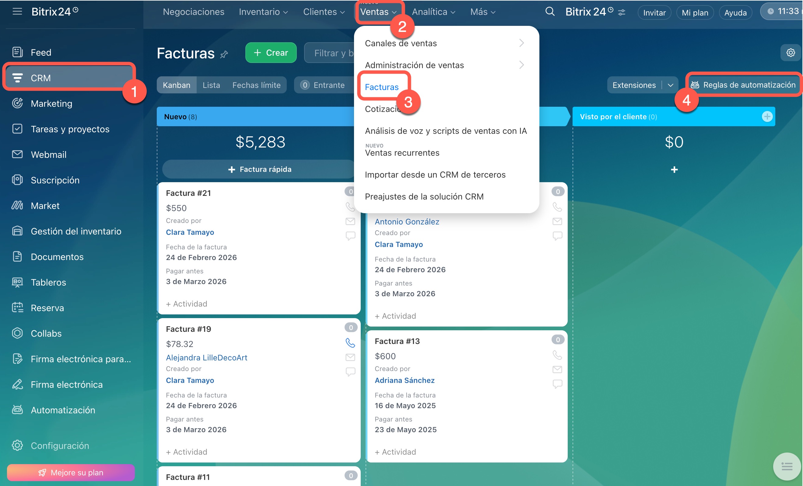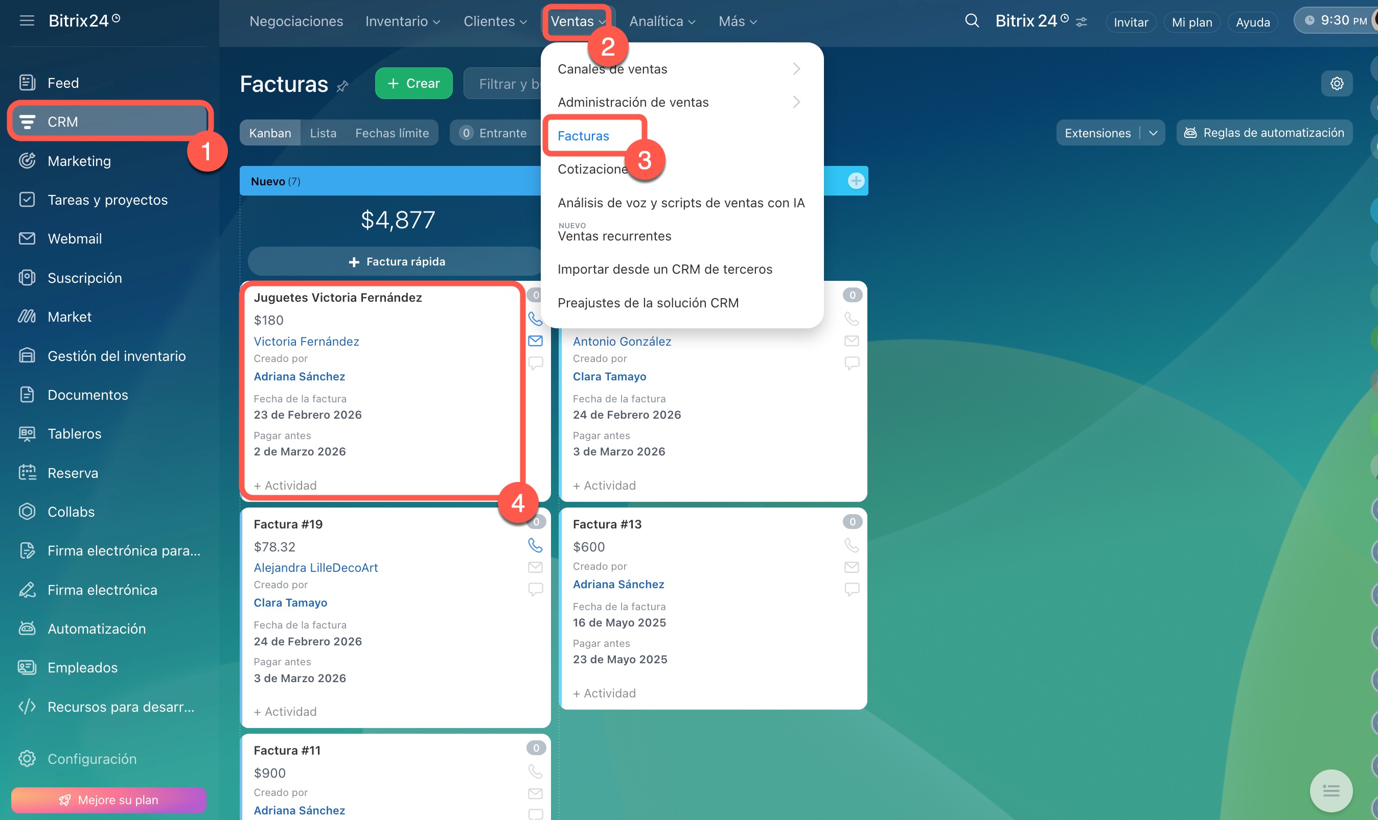 1–2. Abre la sección CRM > Facturas.