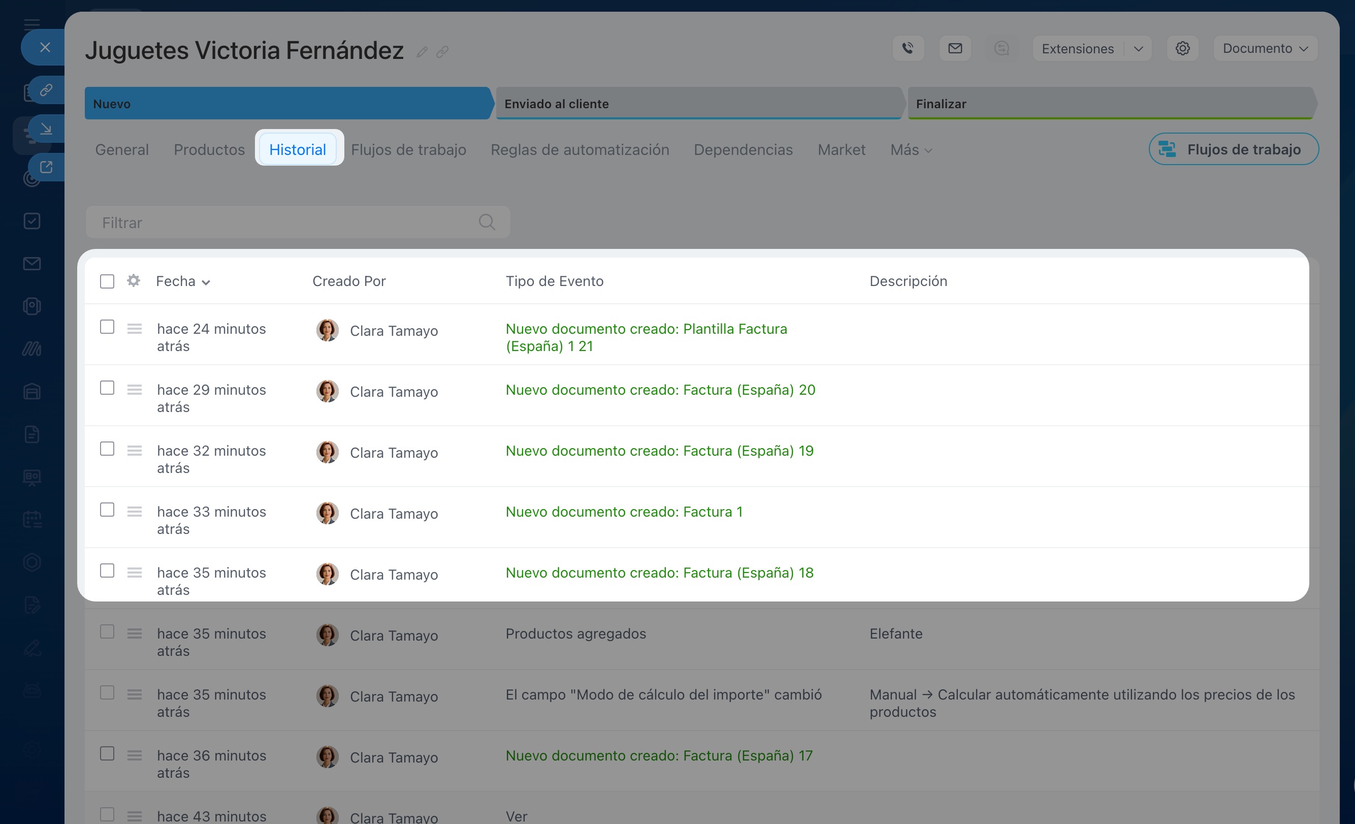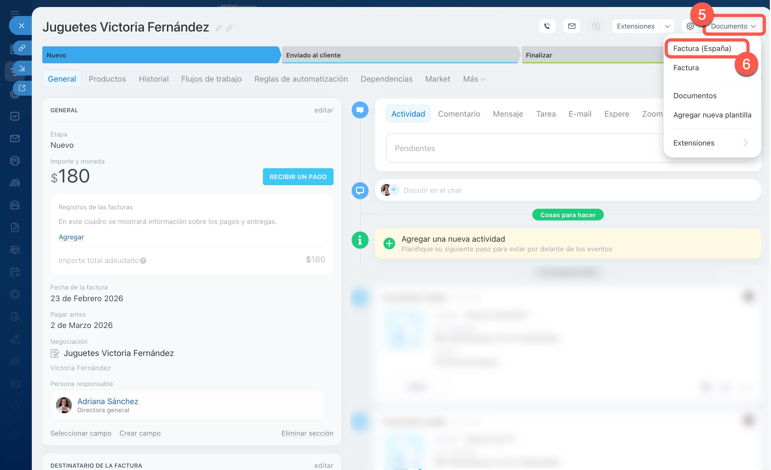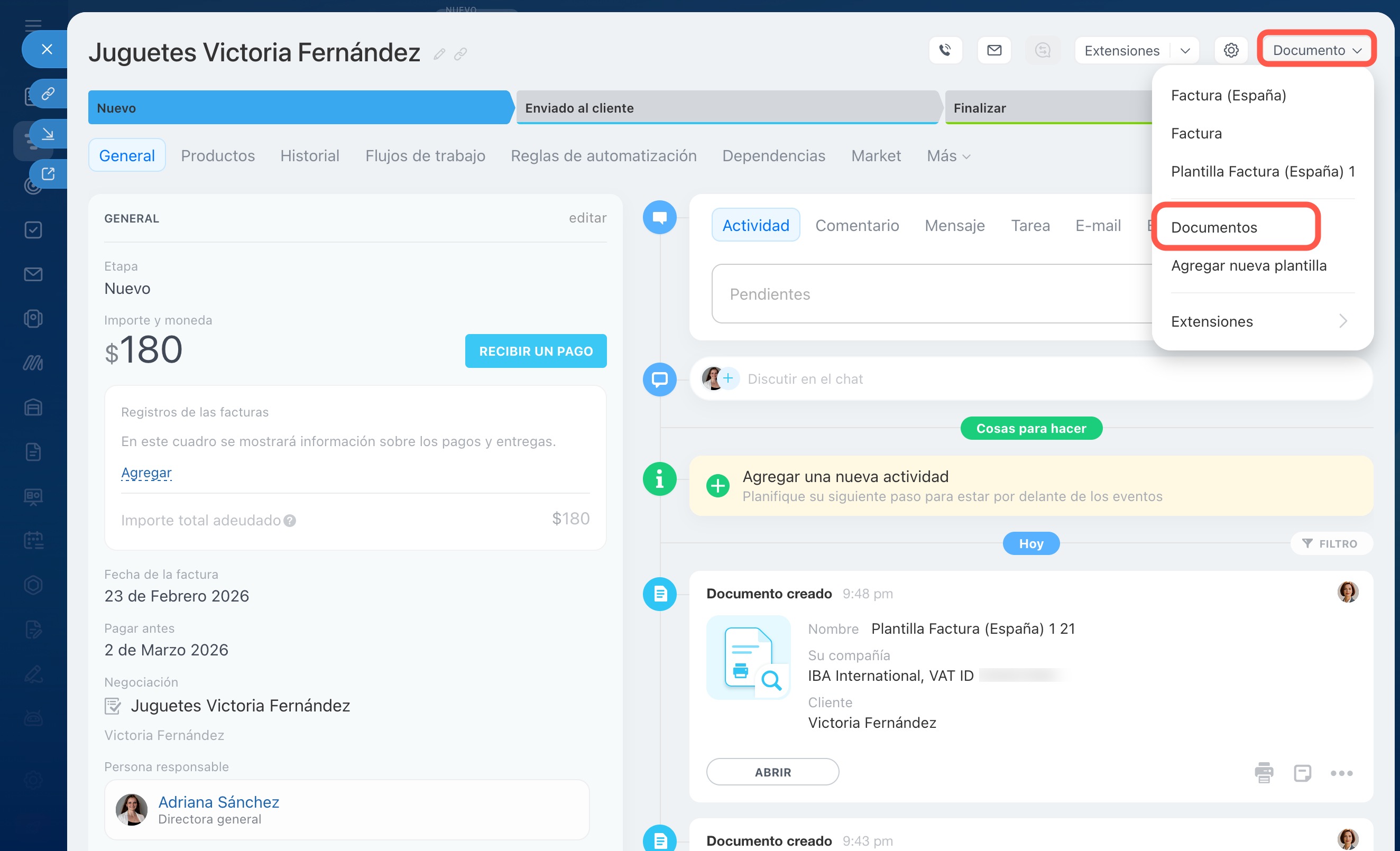 Verifiquemos cómo funcionan las reglas de automatización y los disparadores. El gerente crea una factura a partir de una negociación; la ficha de la factura pasa a la etapa Nuevo. Después de verificar los datos, la mueve a la etapa Enviado al cliente. La primera regla de automatización crea la factura y la segunda la envía al cliente por correo electrónico.