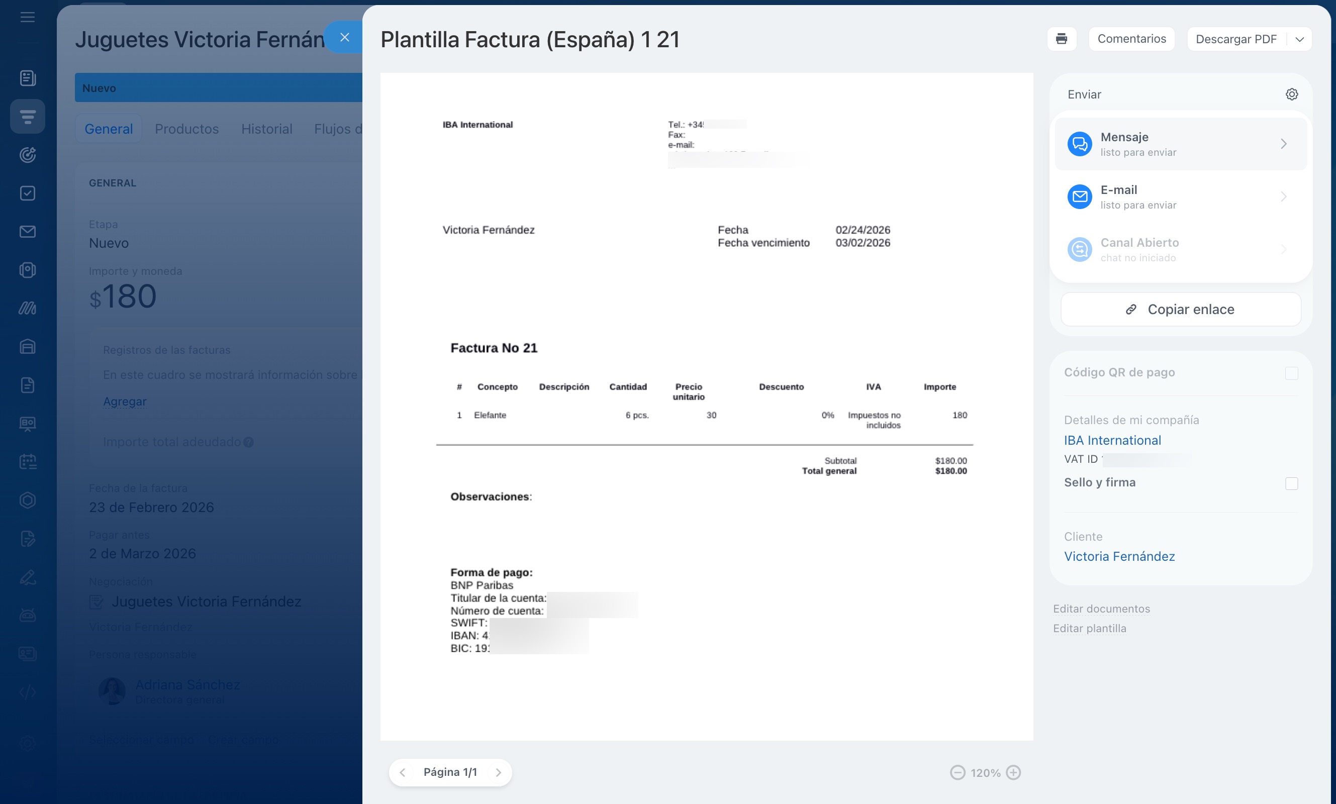 Puedes crear y enviar una factura al cliente directamente desde el CRM; el documento se completa automáticamente sin necesidad de ingresar datos manualmente.