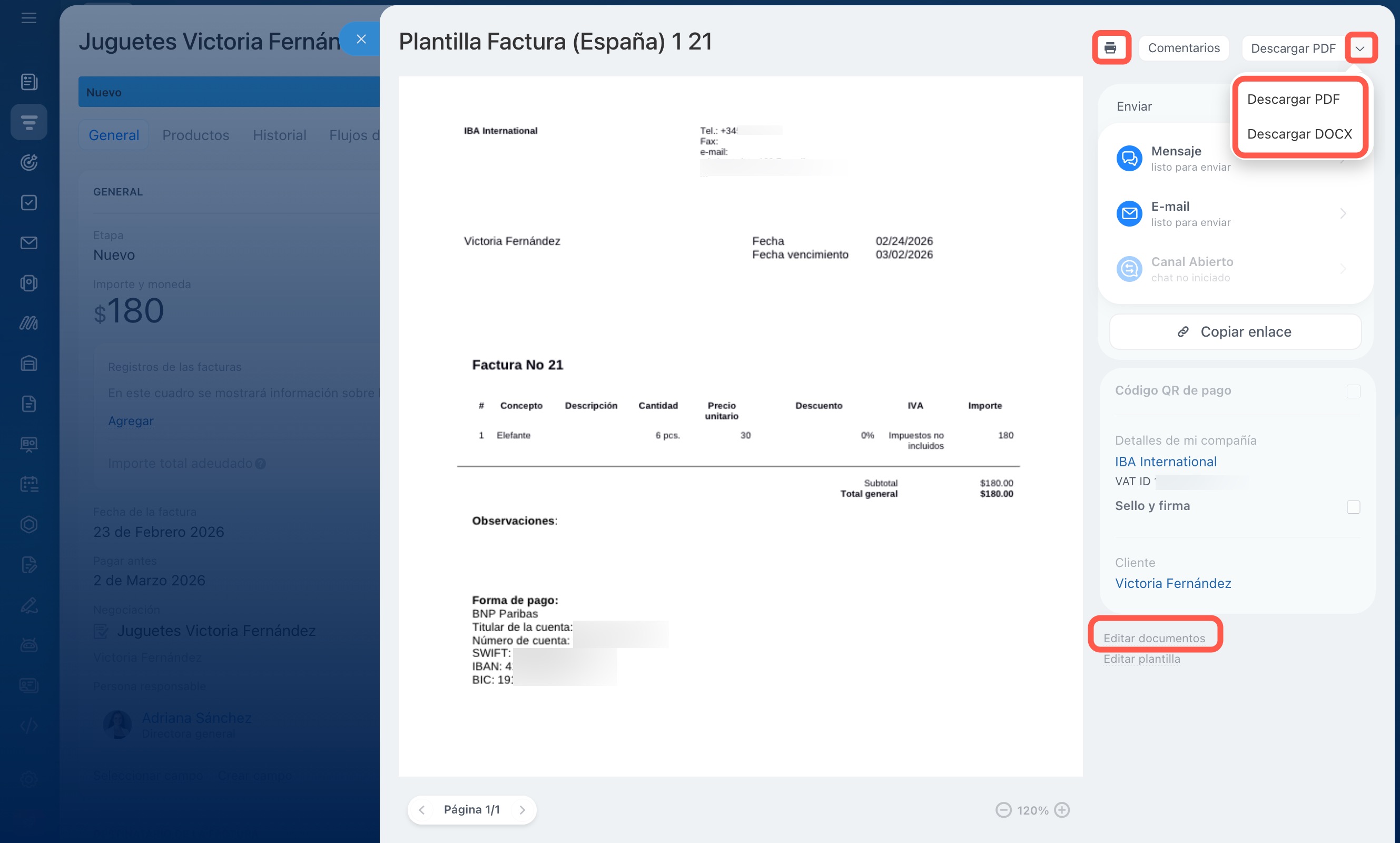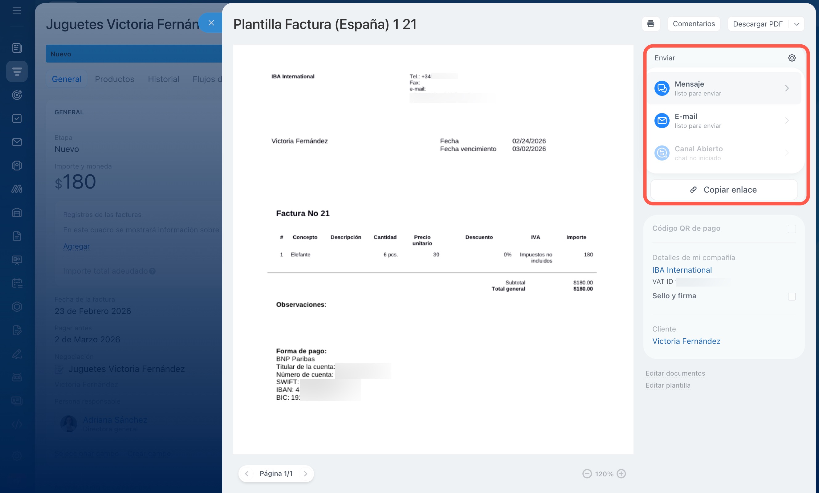 - Puedes crear una factura desde la ficha de una negociación, desde la sección Facturas o a partir de otros elementos de CRM, como una cotización, contacto o compañía.