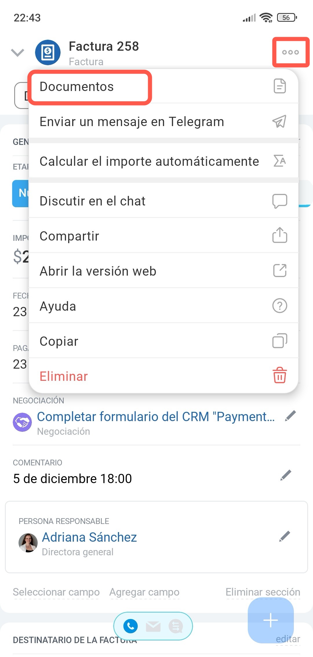 Desde la ficha de una negociación o cotización. Este método es adecuado si ya estás trabajando con una negociación y deseas emitir una factura rápidamente. Por ejemplo, si ya has acordado las condiciones con el cliente, añadido productos y acordado el monto. Para no crear la factura manualmente, puedes generarla directamente desde la ficha de la negociación; los datos del cliente y los productos se transferirán automáticamente al documento.