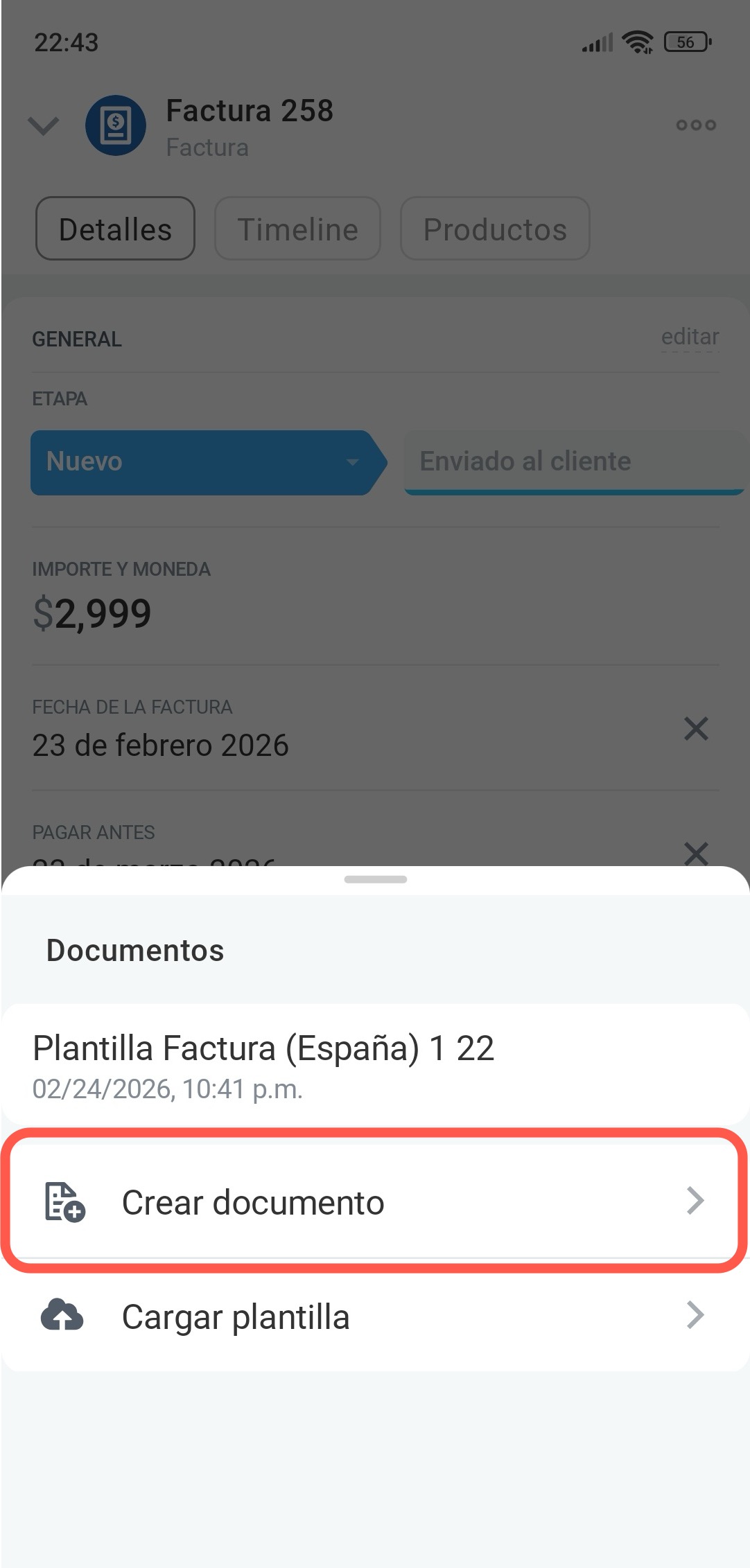 Para crear un documento, en la ficha de la factura toca Tres puntos (...) > Documentos > Crear documento y selecciona la plantilla necesaria. Puedes cargar una nueva plantilla solo desde Bitrix24 en la computadora.