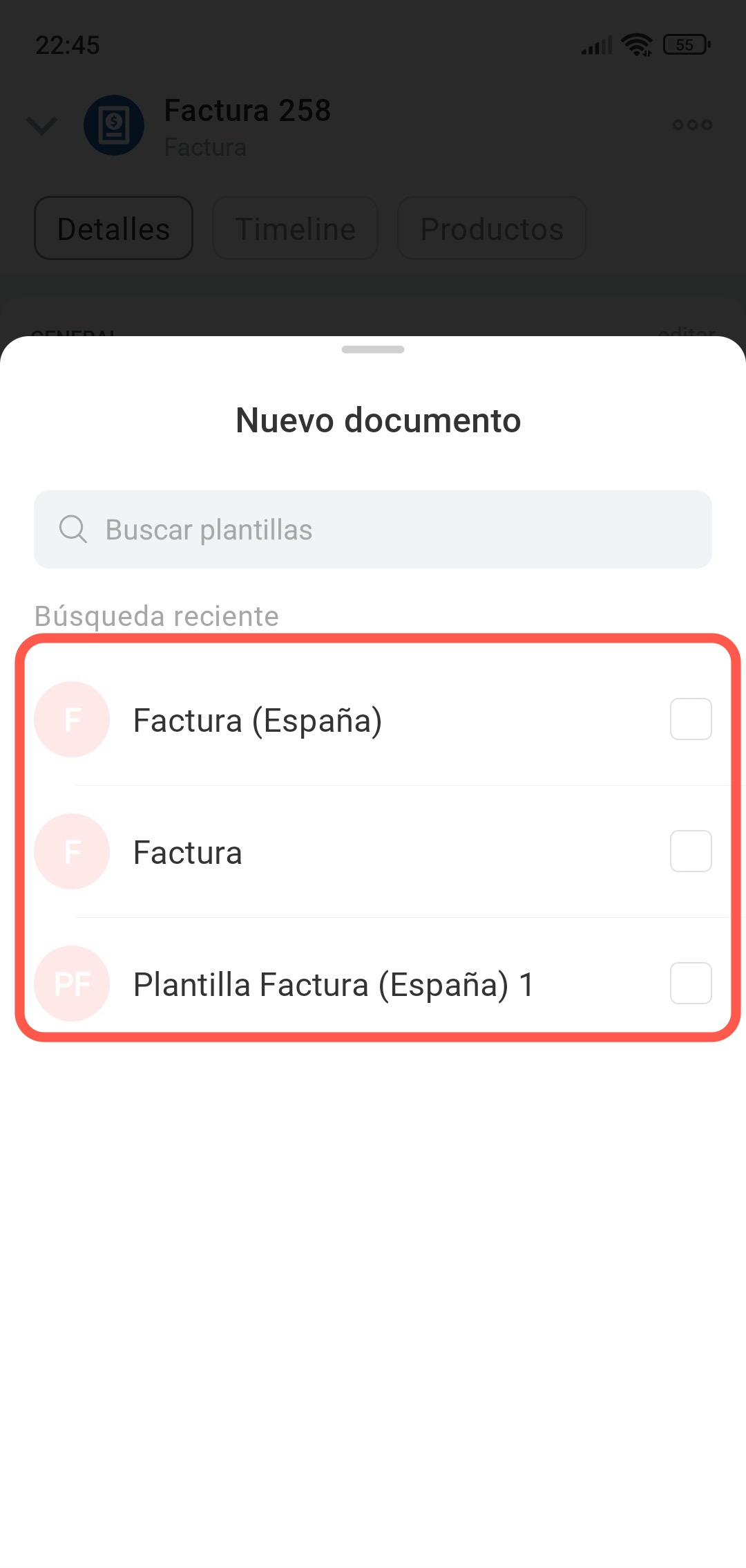 Todos los documentos creados se guardan en el timeline de la ficha de la factura, en la pestaña Historial y en la sección Documento > Documentos.