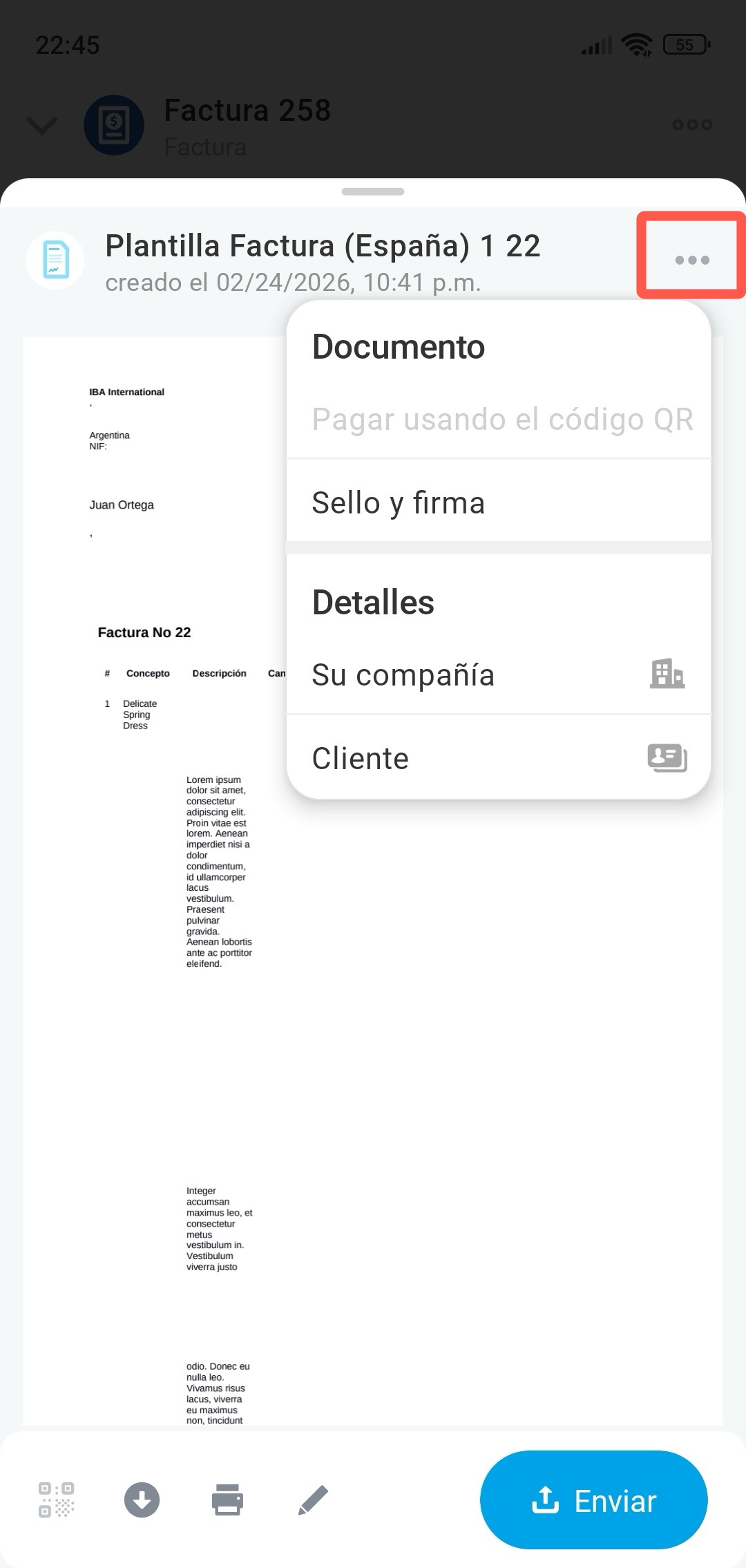 Para enviar el documento al cliente, toca Enviar.
