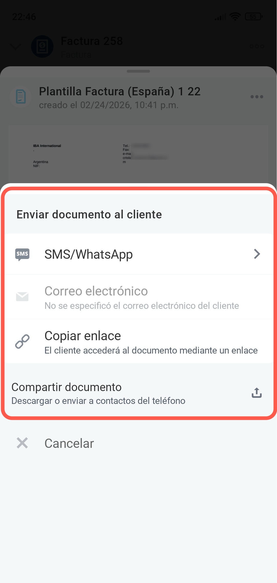 - Por SMS: si tienes configurado un proveedor de SMS y has indicado el número de teléfono del cliente. El cliente recibirá un enlace al documento.