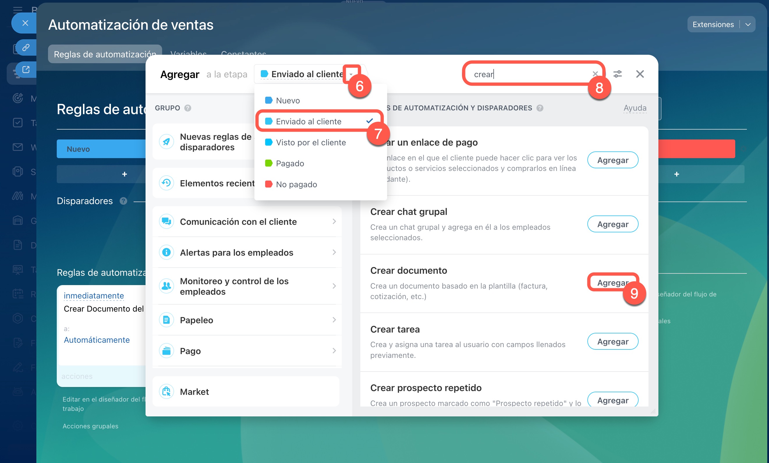 6–7. Selecciona la etapa en la que necesitas crear la regla de automatización, por ejemplo, Enviado al cliente.