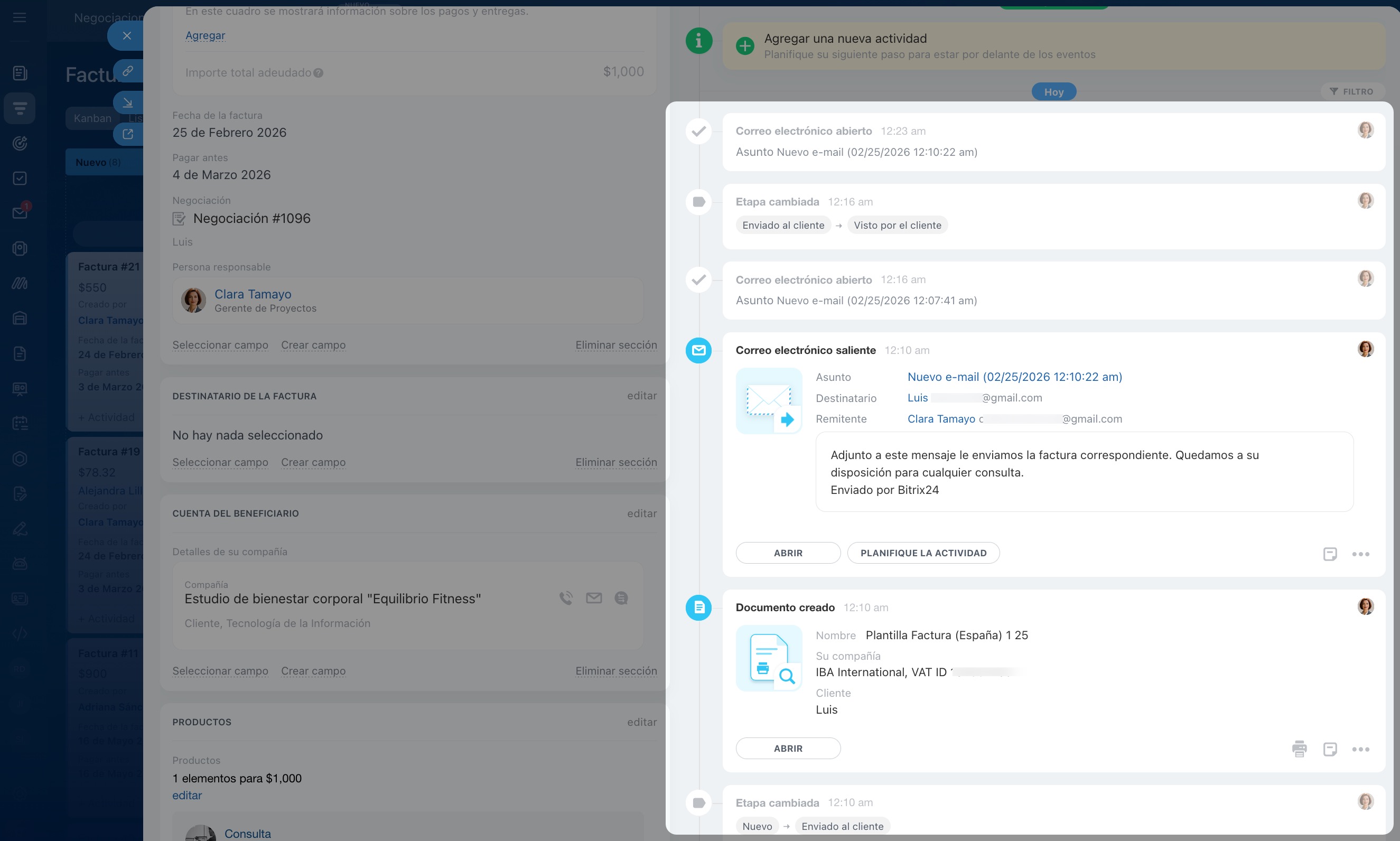 Cuando el cliente abre el correo, el disparador mueve la ficha de la factura a la etapa Visto por el cliente. El gerente ve esto en el CRM y entiende que el cliente ha revisado la factura y puede contactarlo para discutir el pago.