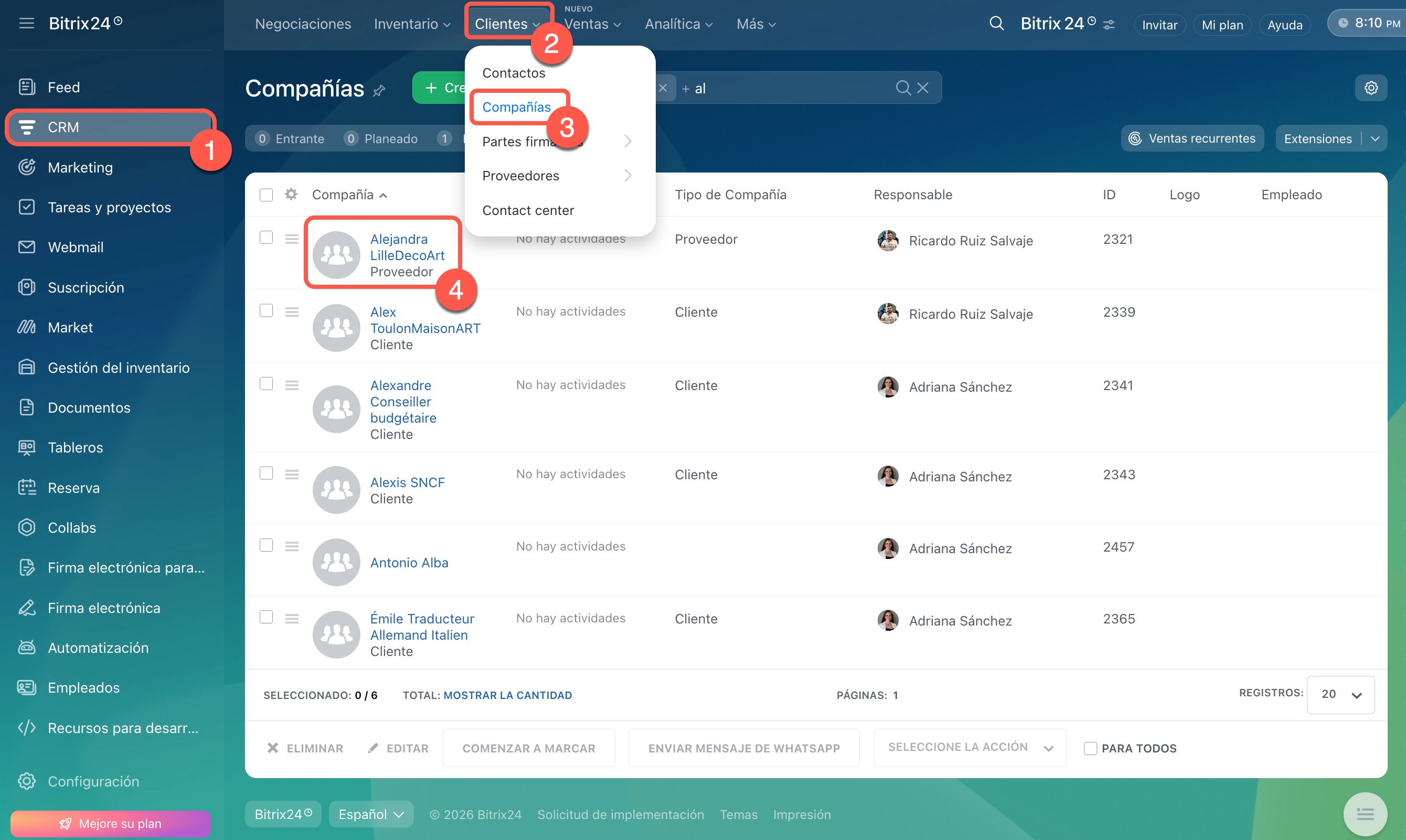 1–4. Ve a CRM > Clientes > Compañías y abre la ficha necesaria.