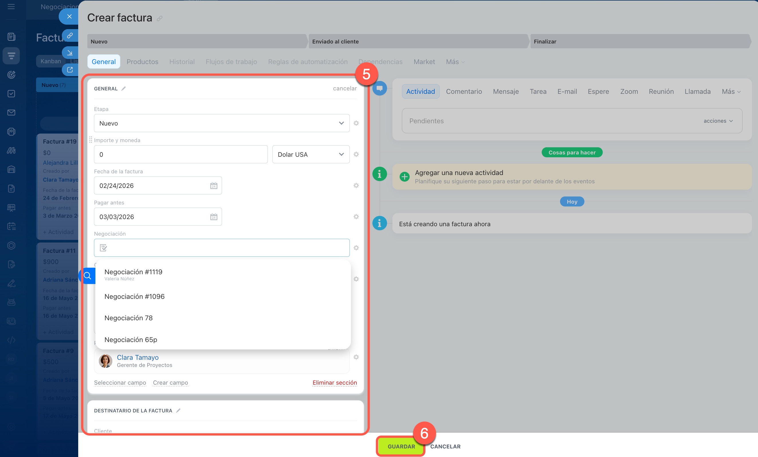 5. Completa los campos en la ficha de la factura. Indica el cliente y la negociación a los que pertenece la factura.