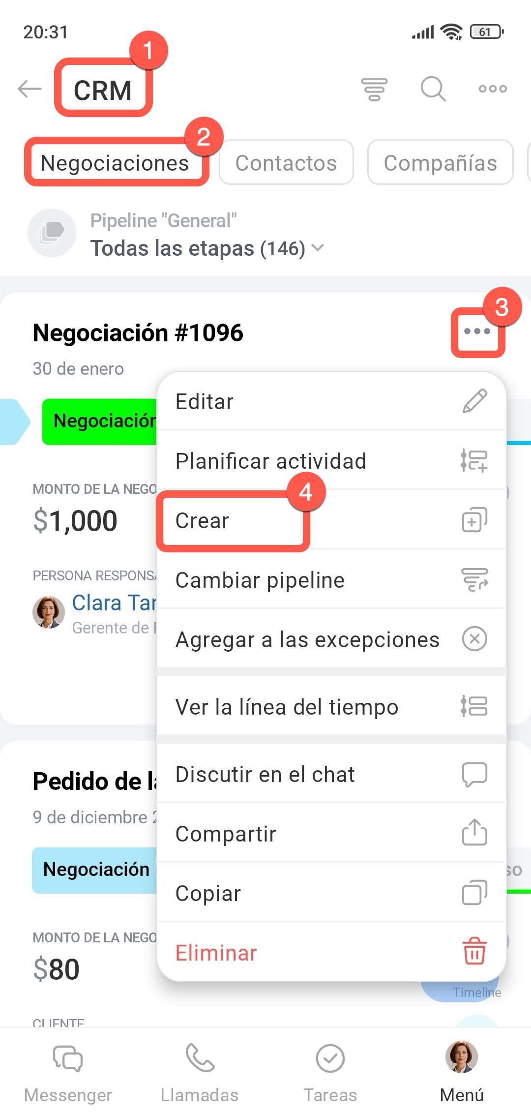 1–3. Ve a CRM > Negociaciones y abre la ficha necesaria.
