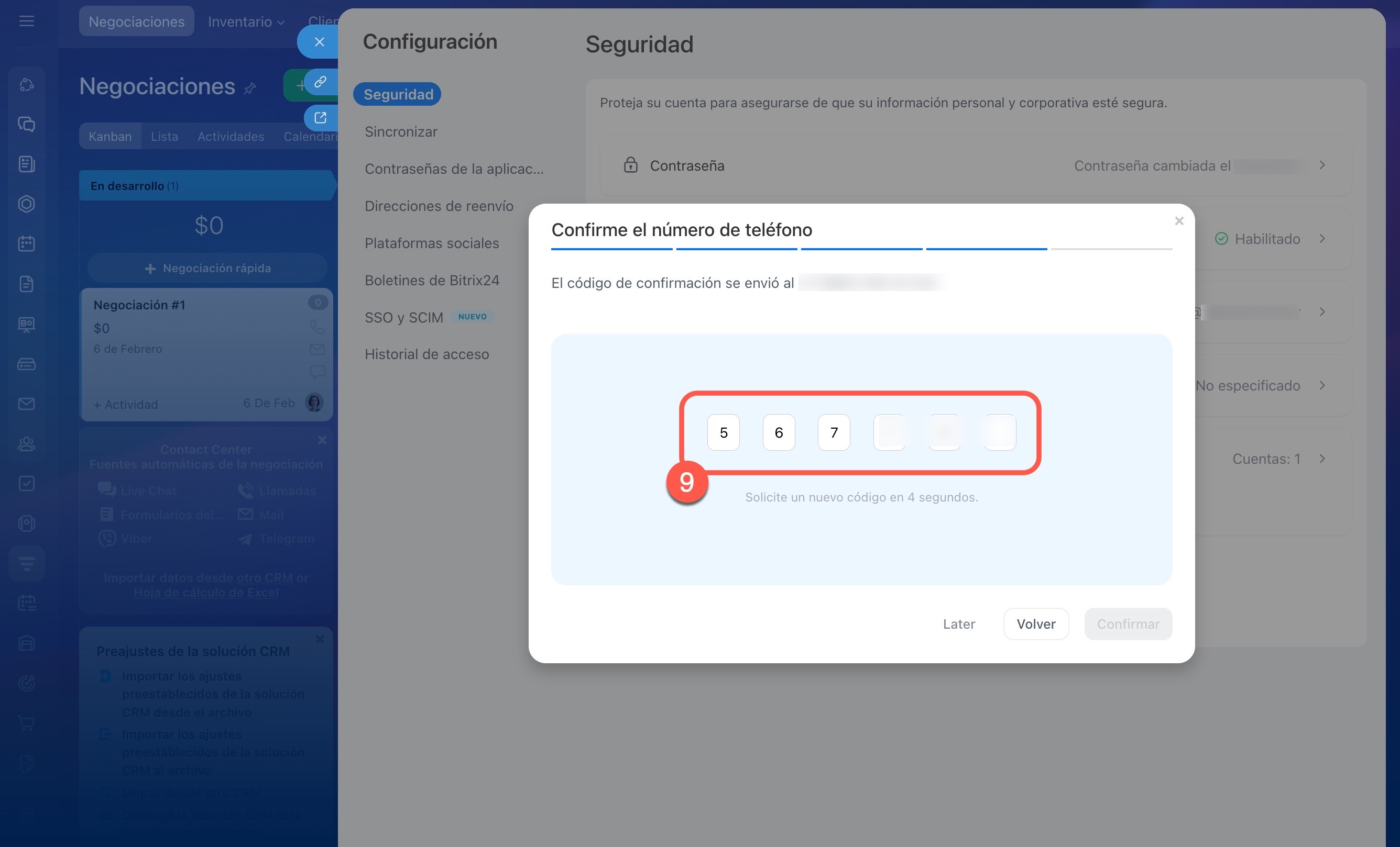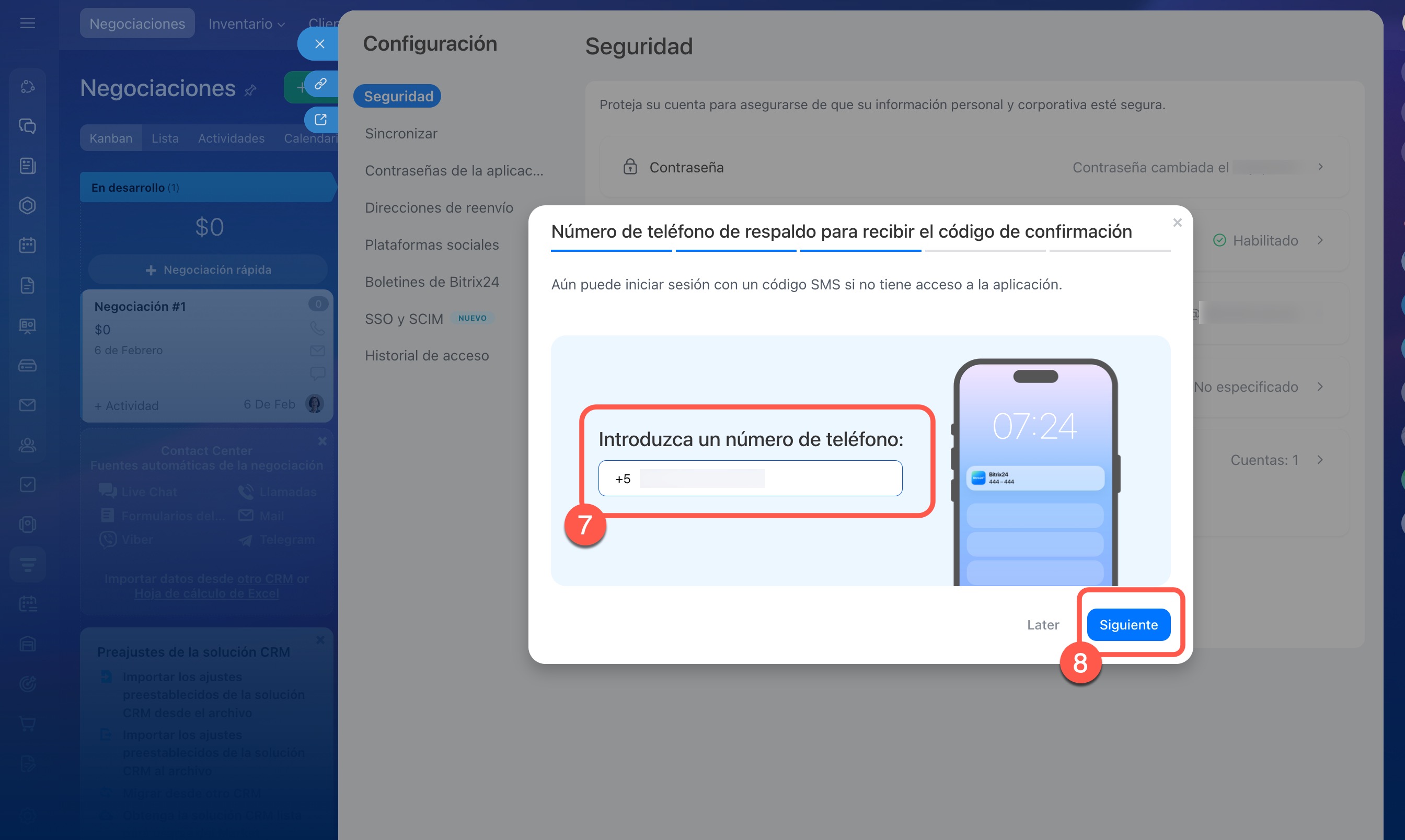 7. Indica tu número de teléfono: es necesario para iniciar sesión en Bitrix24 mediante SMS si no tienes acceso al teléfono con la aplicación móvil.