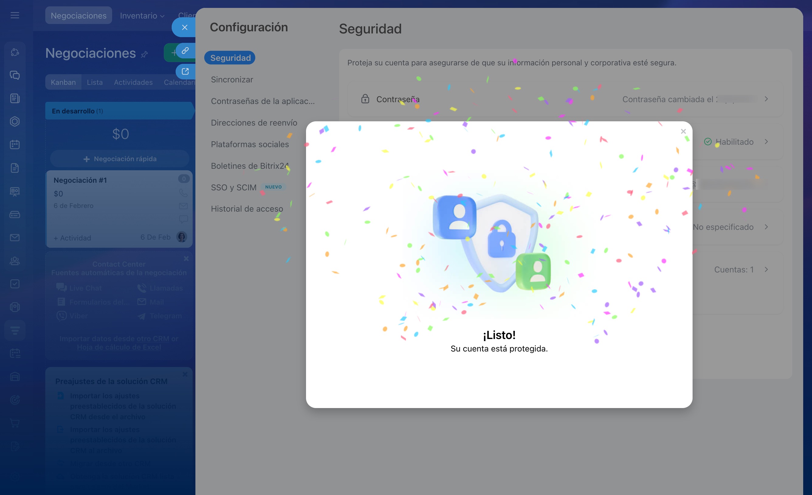 La autenticación en dos pasos es una protección adicional para tu cuenta en Bitrix24: además del nombre de usuario y la contraseña, necesitas un segundo método de confirmación. Sin él, nadie podrá acceder a tu cuenta, aunque conozca tu contraseña.
