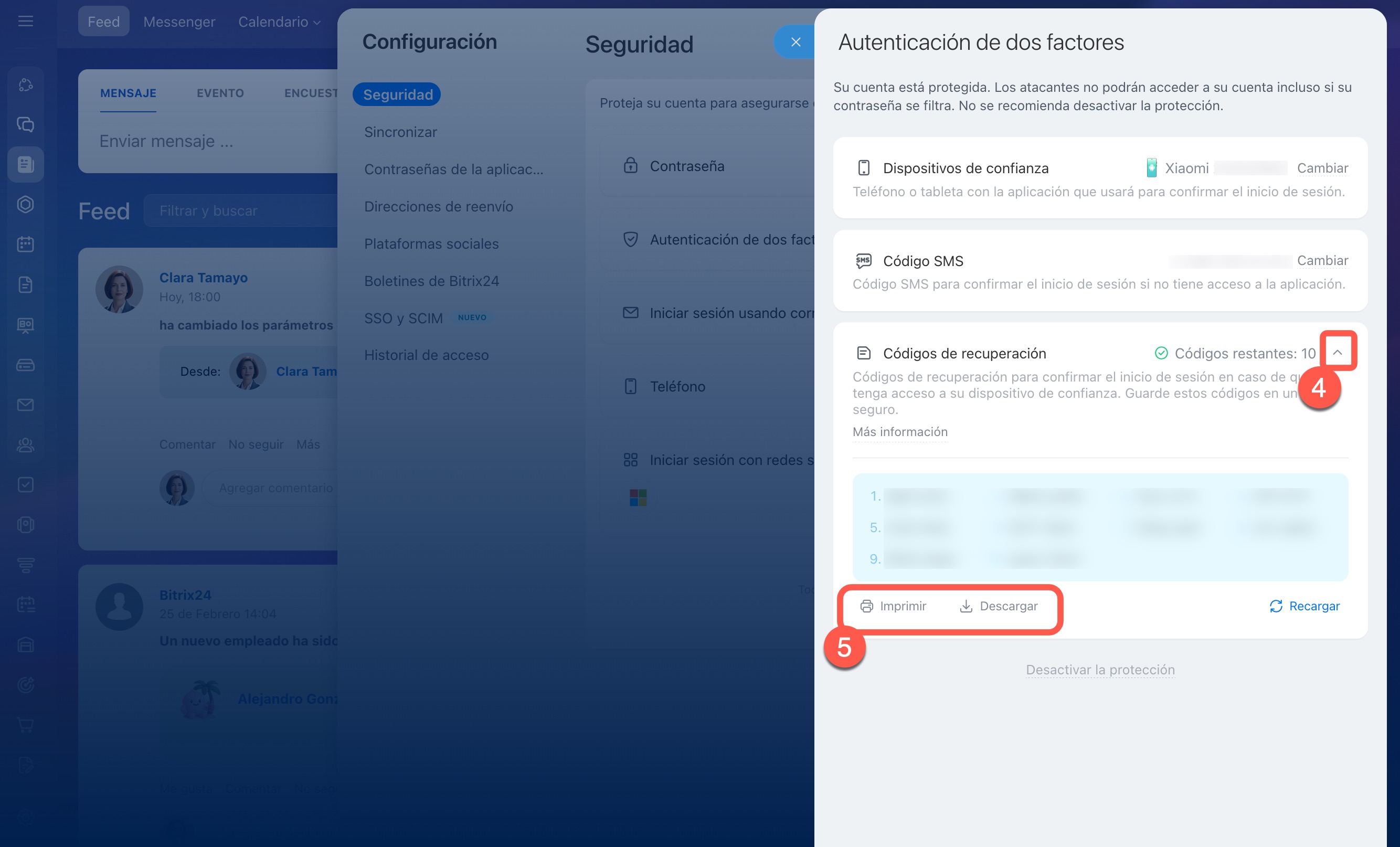 Guardar los códigos de recuperación. Los necesitarás si no puedes confirmar el inicio de sesión en Bitrix24 a través de la aplicación móvil, por ejemplo, si pierdes el teléfono o no está disponible. Después de activar la autenticación en dos pasos, guarda los códigos de inmediato.