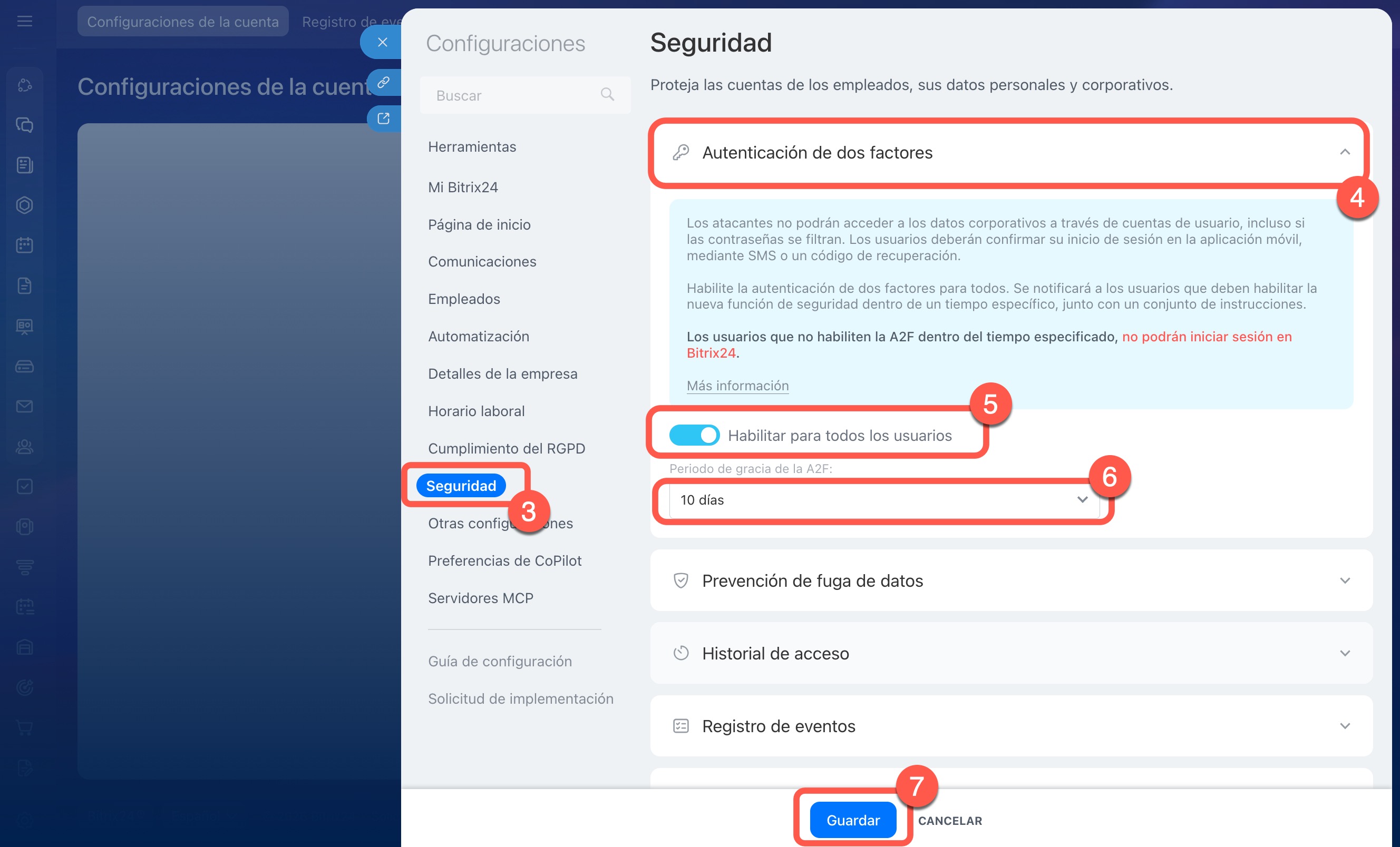 6. Establece el tiempo durante el cual los usuarios deben configurar la autenticación en dos pasos para sus cuentas.