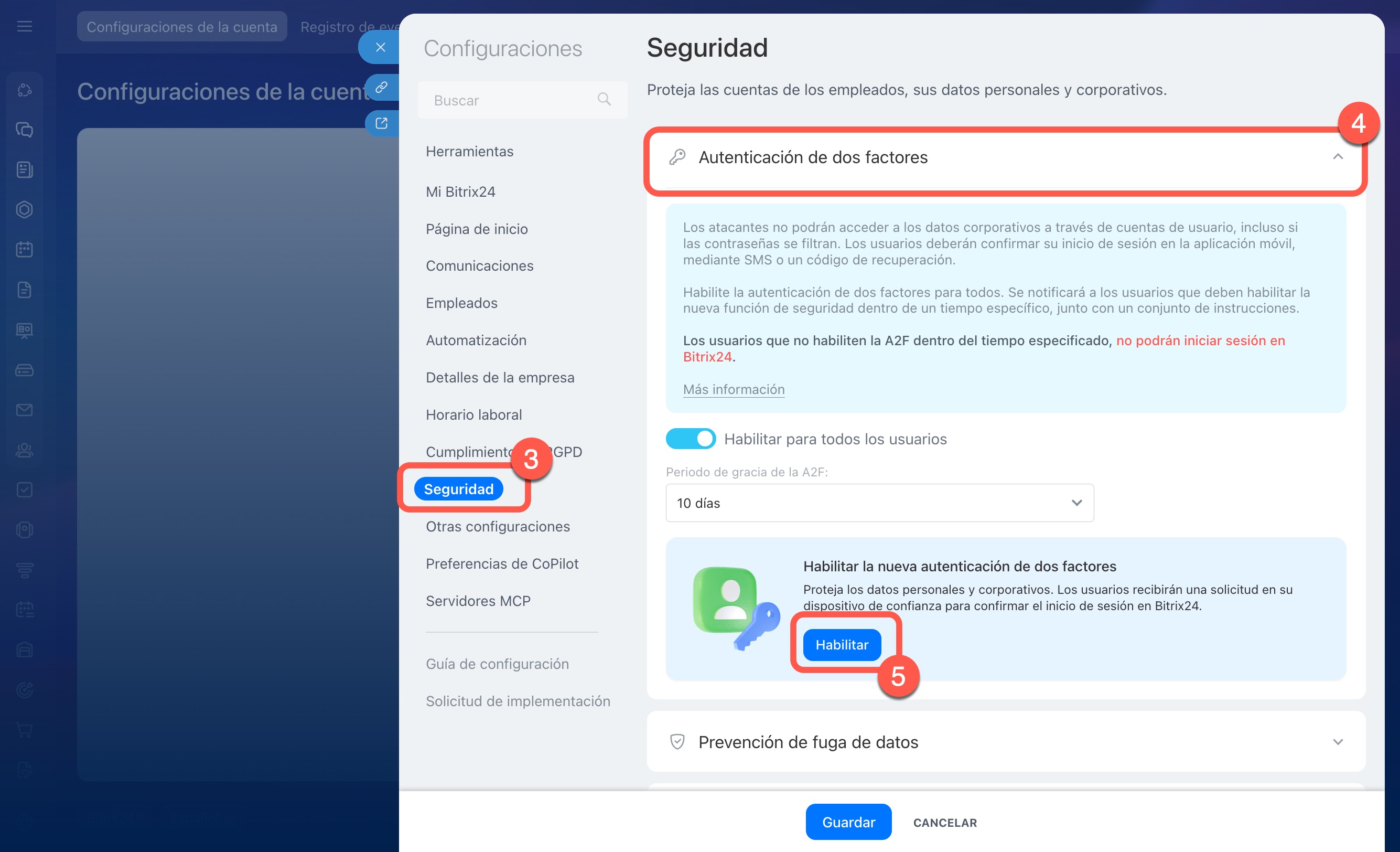 Cada usuario configura la autenticación en dos pasos para su propia cuenta. El administrador puede hacerla obligatoria para toda la compañía; en ese caso, los empleados deben activarla dentro del plazo establecido.