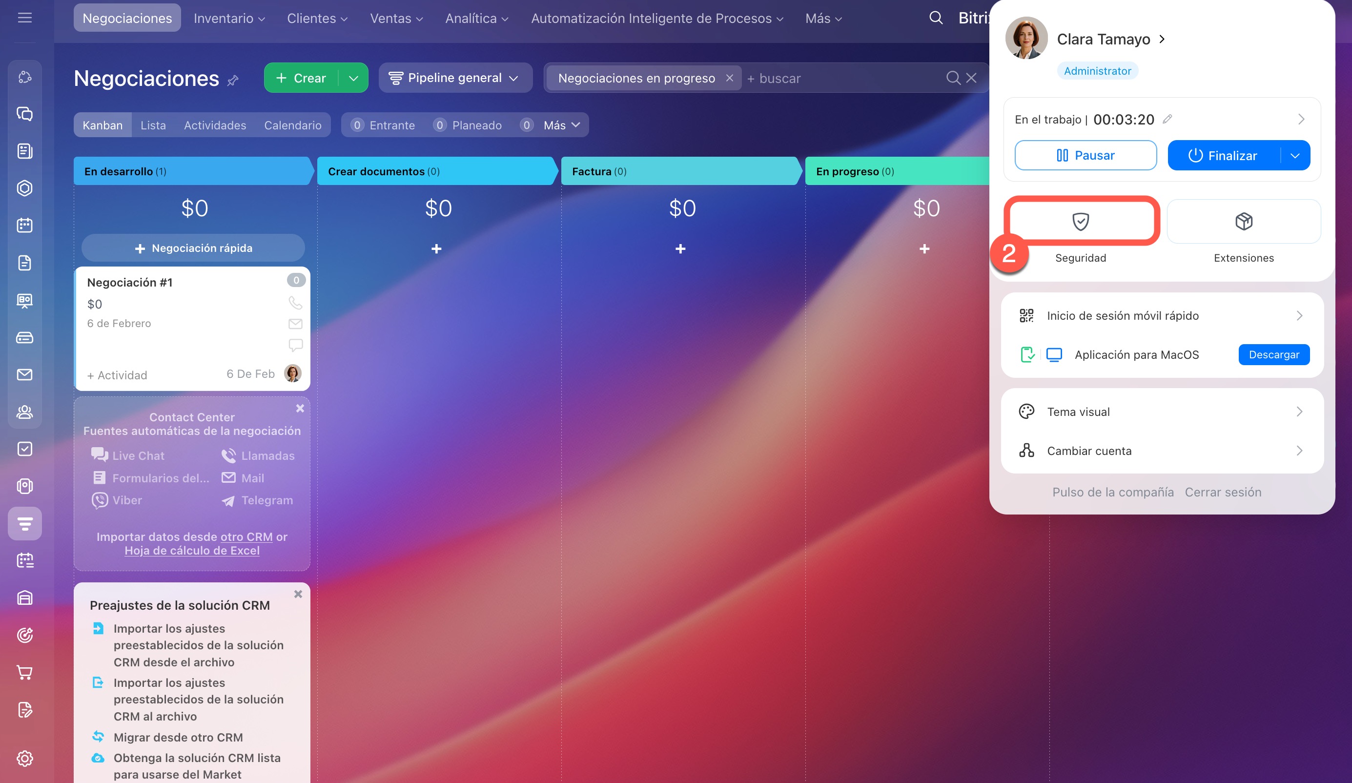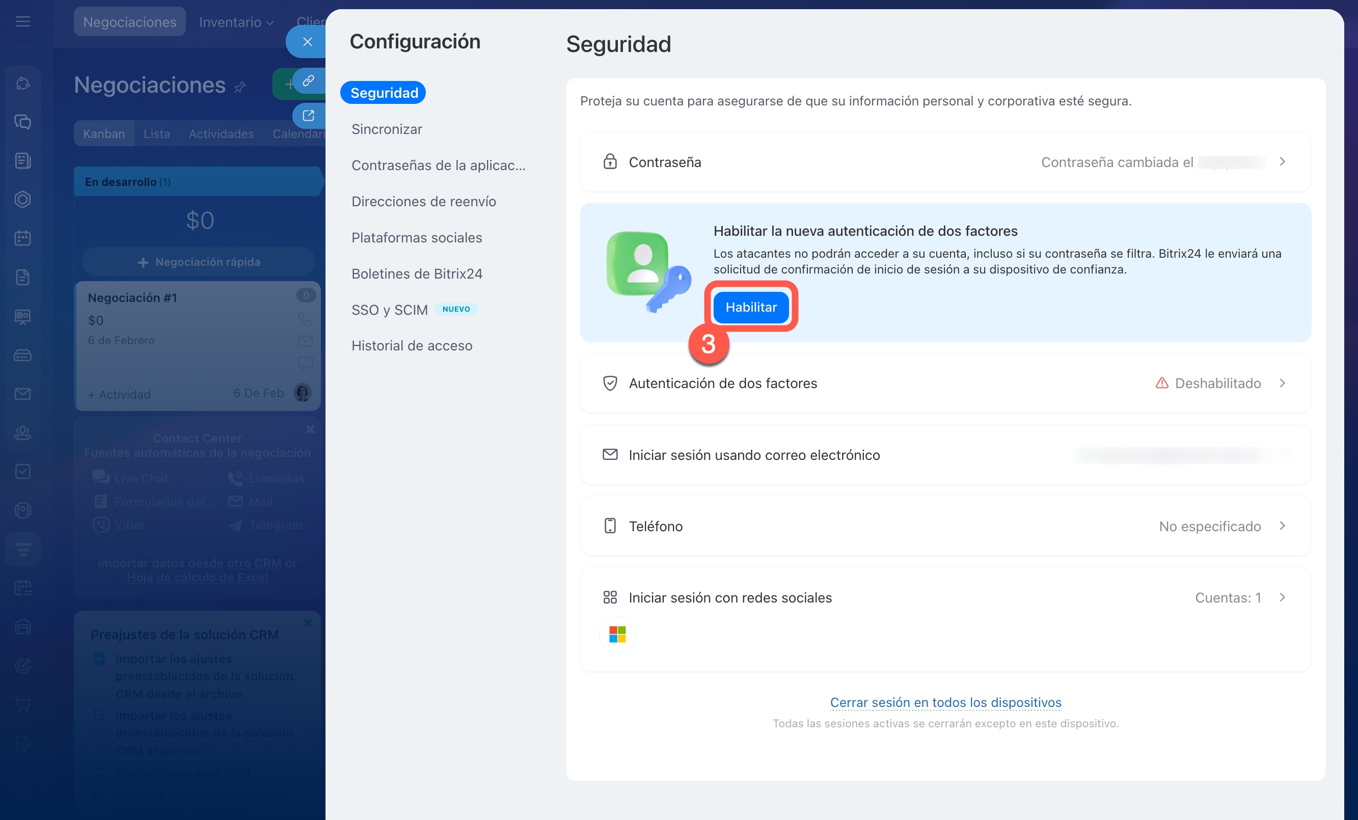 - Para configurar la autenticación en dos pasos, instala la aplicación móvil de Bitrix24 y autentícate en ella. En Bitrix24 en la computadora, ve a tu perfil, selecciona Seguridad > Habilitar.