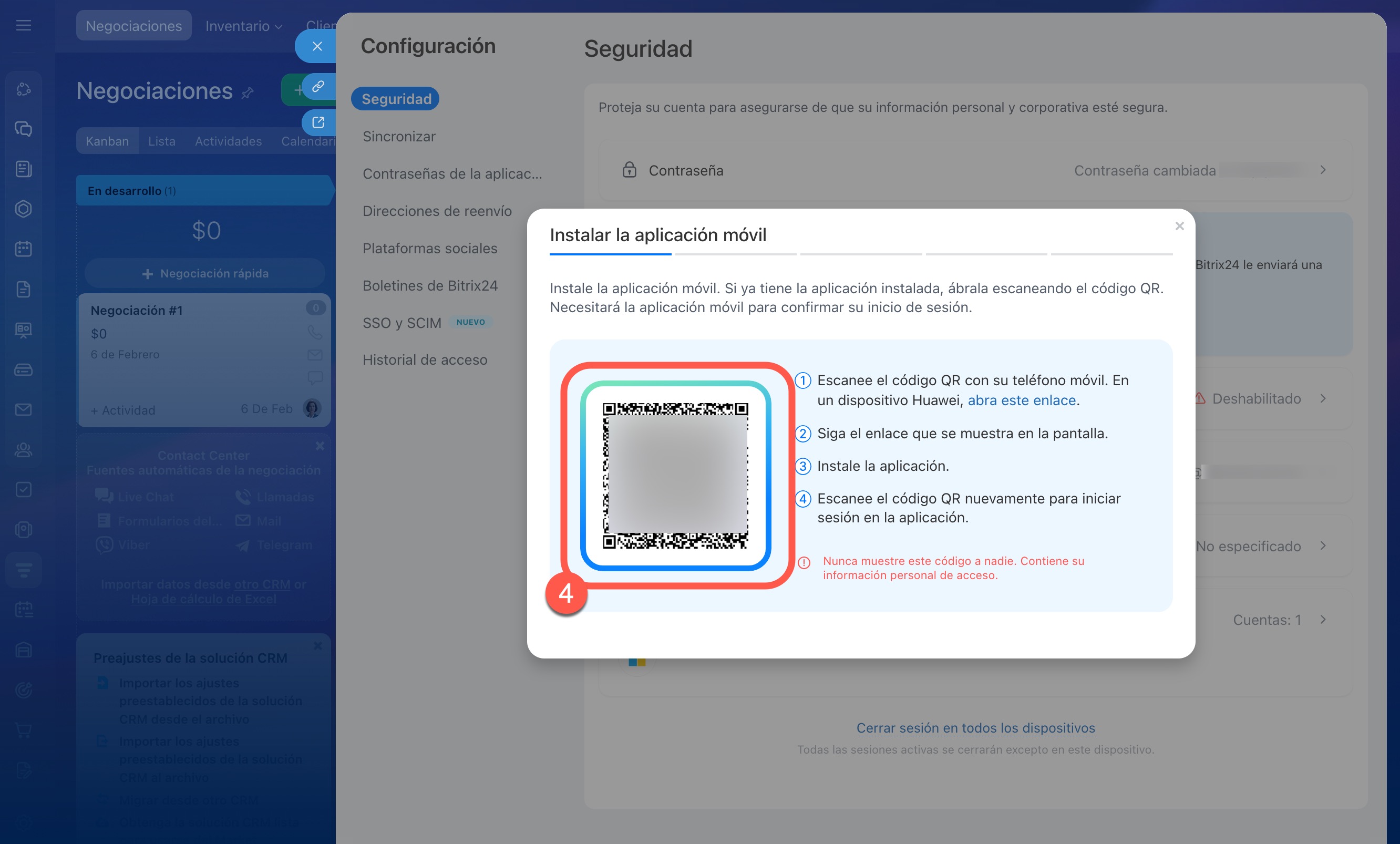 Activar la autenticación en dos pasos. La configuración de la autenticación en dos pasos en las cuentas de empleados y administradores se realiza de la misma manera. Para ello, instala la aplicación móvil de Bitrix24 y autentícate en ella.