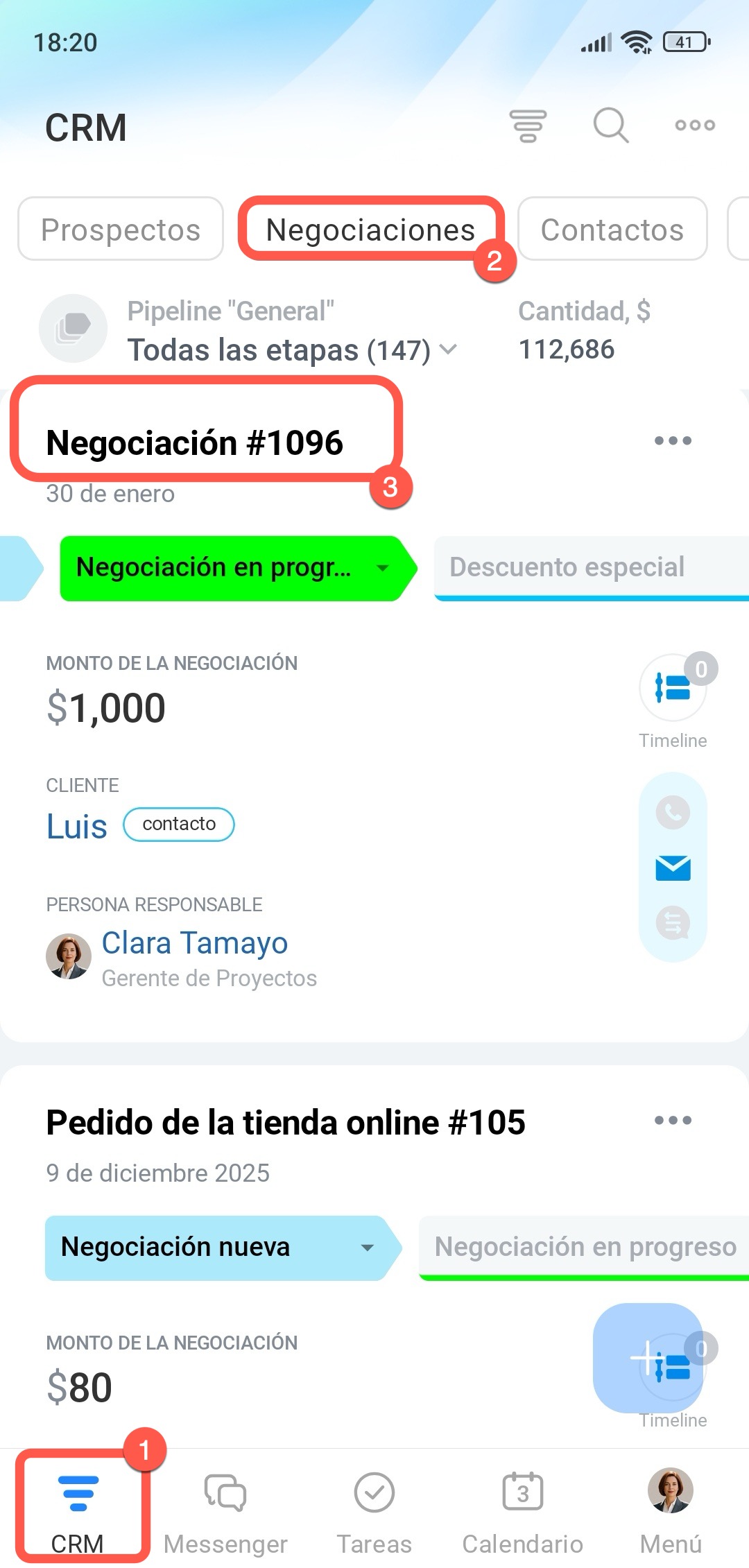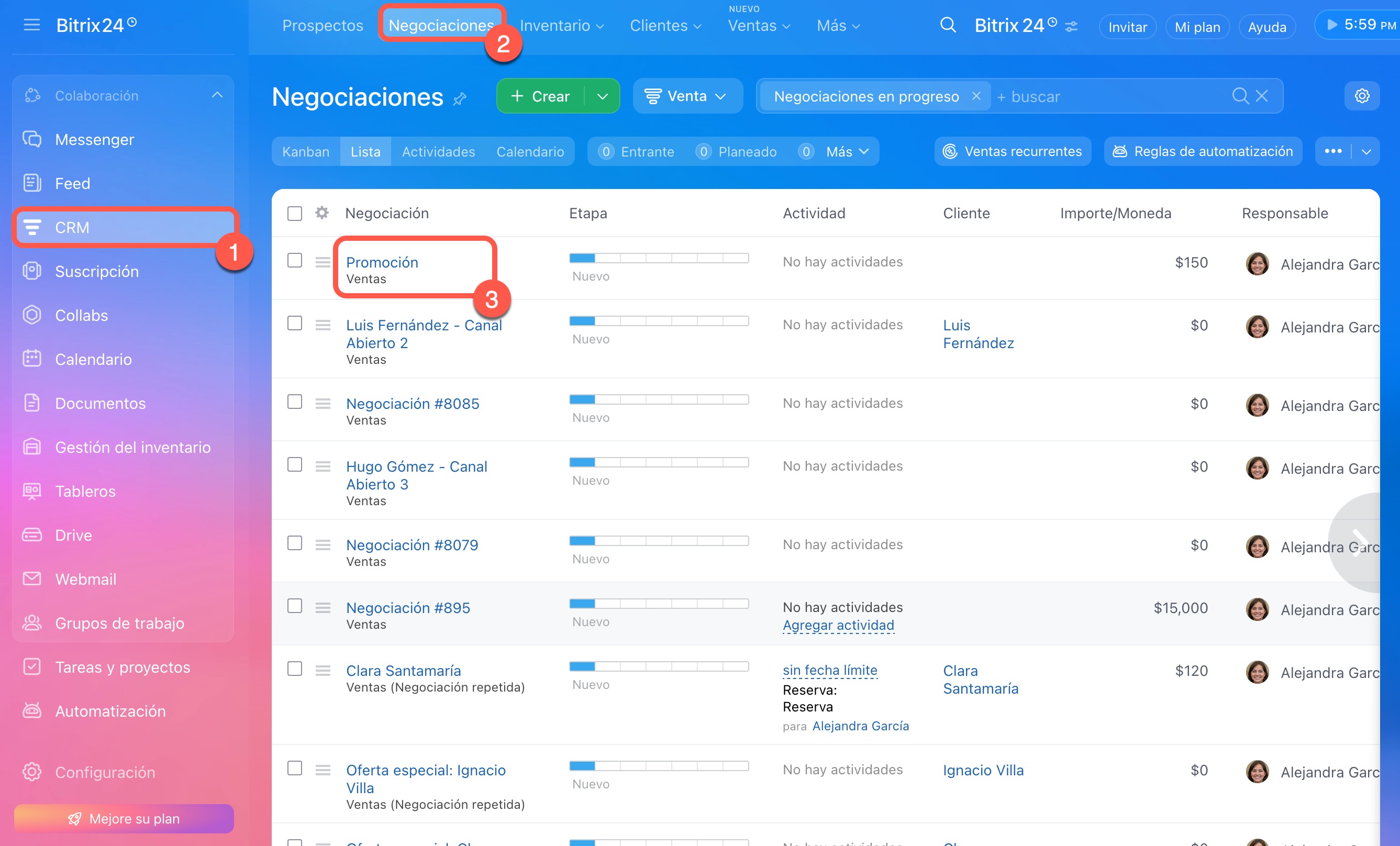 1–3. Ve a la sección CRM > Negociaciones y abre la que necesites.