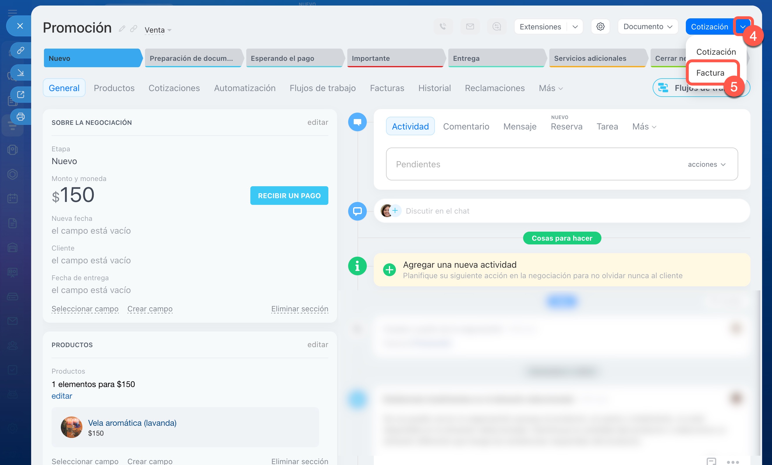 1–3. Ve a CRM > Negociaciones y abre la que necesites.