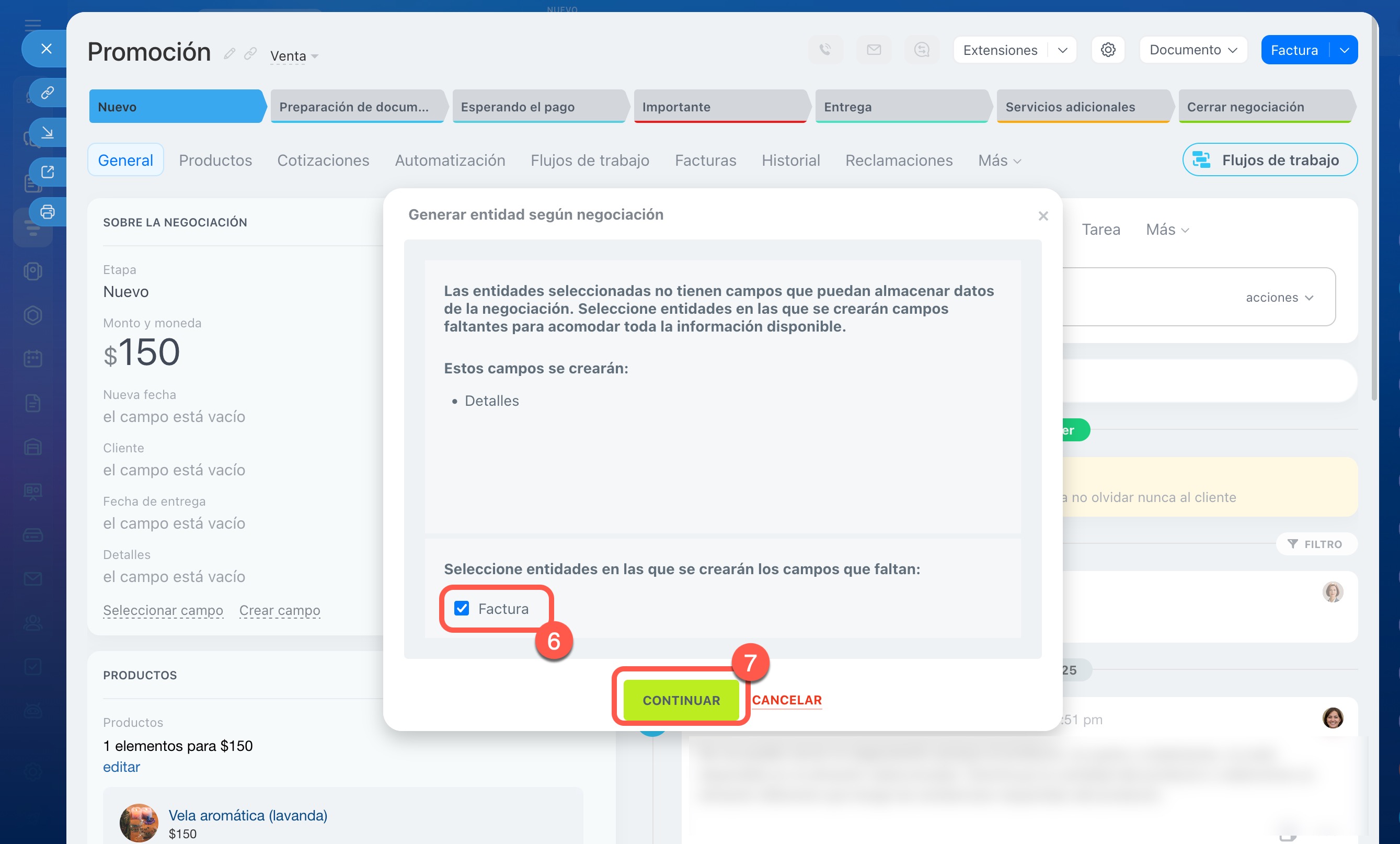 5–7. Selecciona Factura. Si el elemento original tiene campos personalizados que no existen en el nuevo elemento, se te ofrecerá crear los mismos campos. Marca la casilla junto al elemento si deseas crear los campos y haz clic en Continuar. Se creará una factura basada en la negociación y se abrirá su ficha.