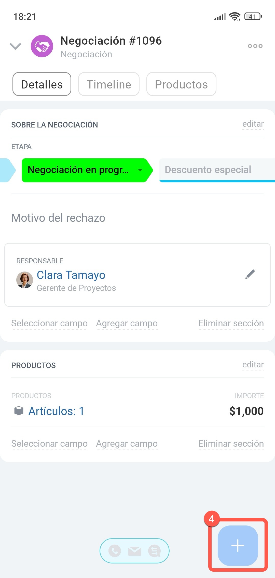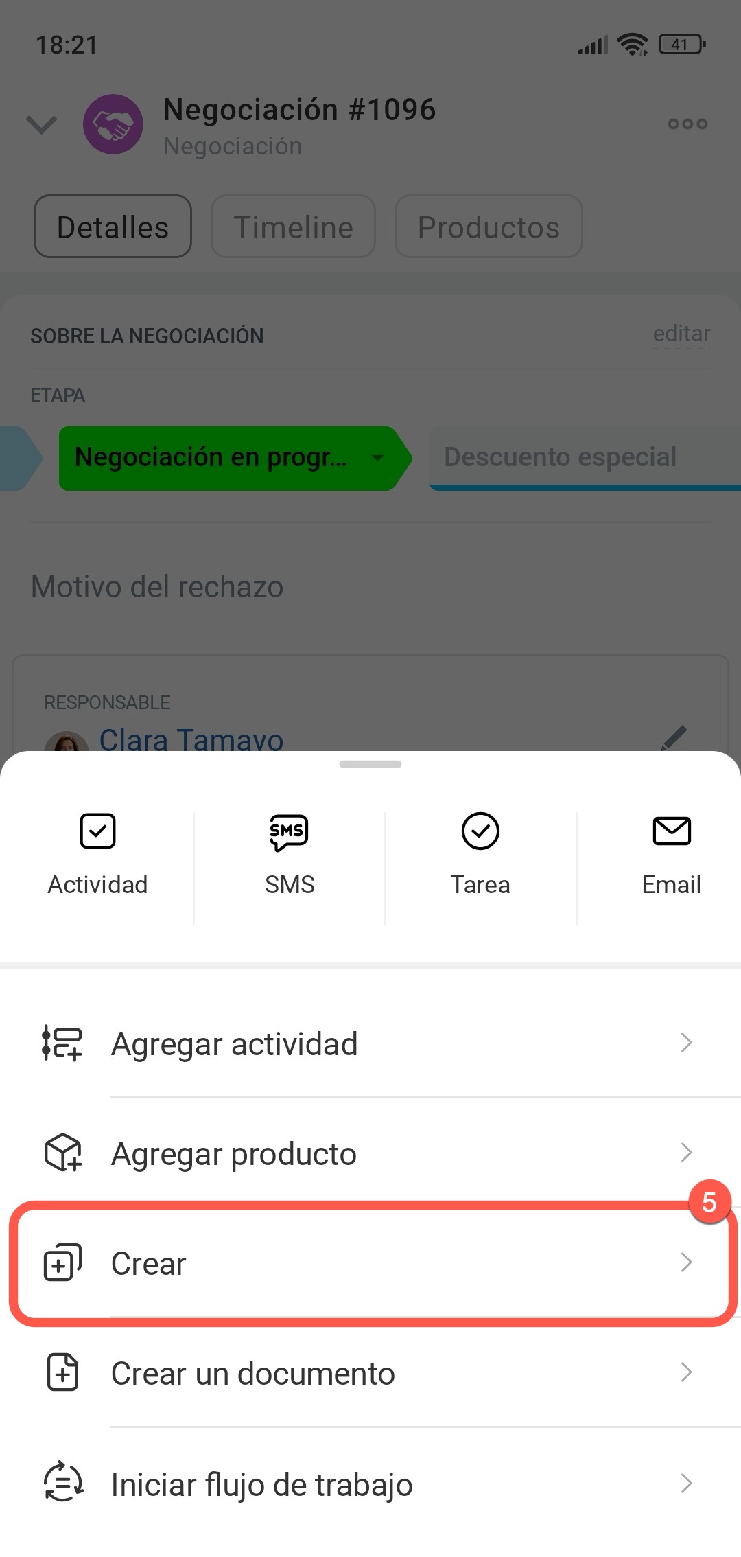 - En la app móvil, ve a CRM > Negociaciones y abre la que necesites. Toca Más (+) en la esquina inferior derecha, toca Crear y selecciona el elemento.