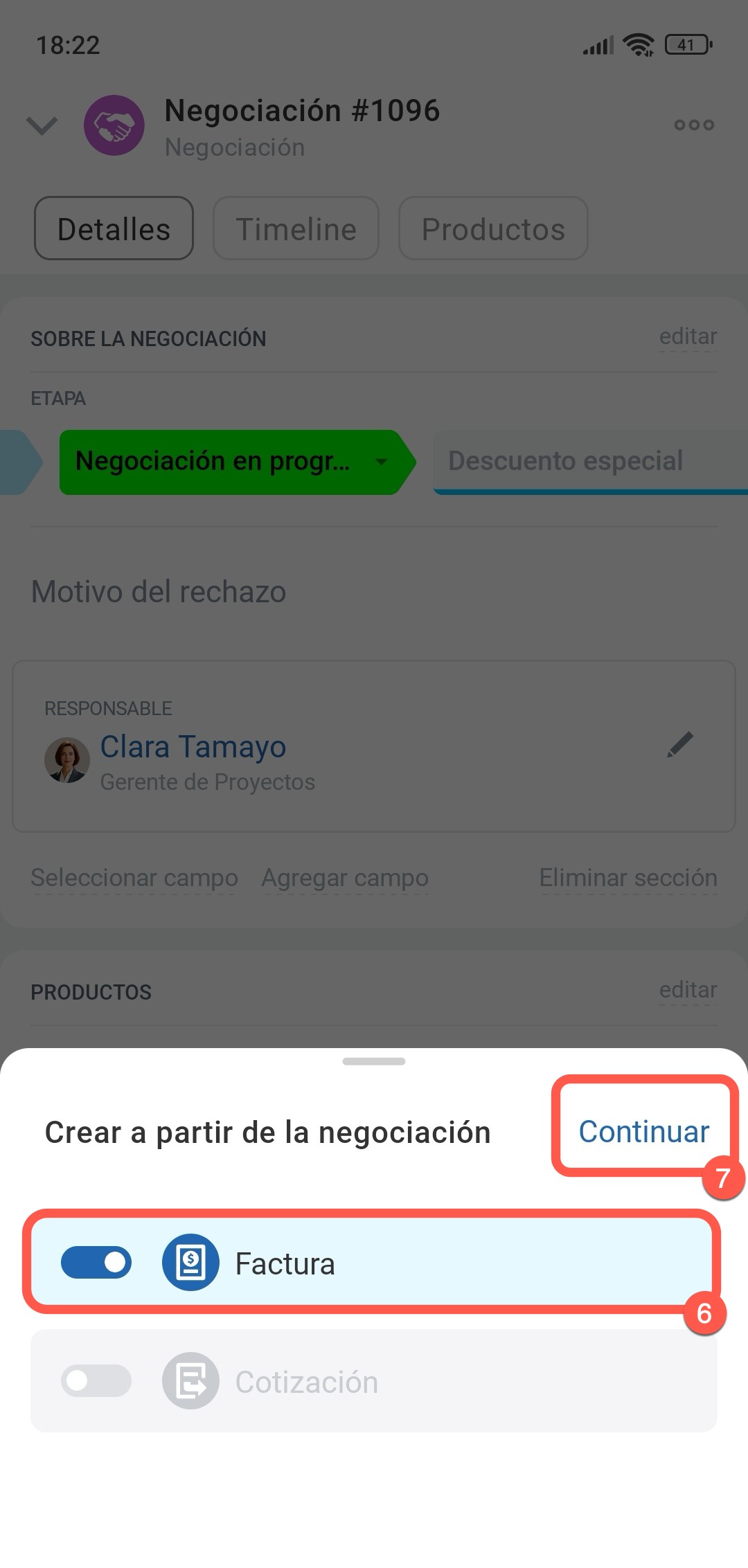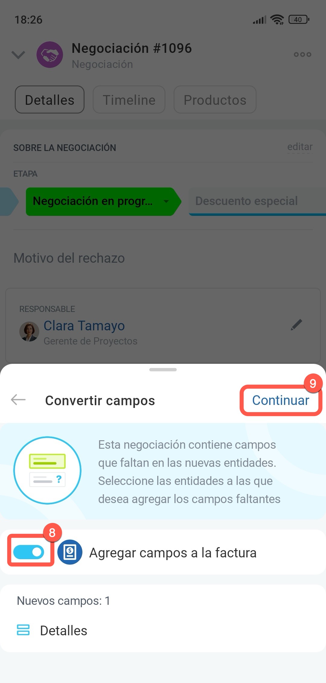 5–9. Selecciona Crear > Factura y toca en Continuar. Si el elemento original tiene campos personalizados que no existen en el nuevo elemento, se te ofrecerá crear los mismos campos. Activa el interruptor junto al elemento si deseas crear los campos y haz clic en Continuar. Se creará una factura basada en la negociación y se abrirá su ficha.