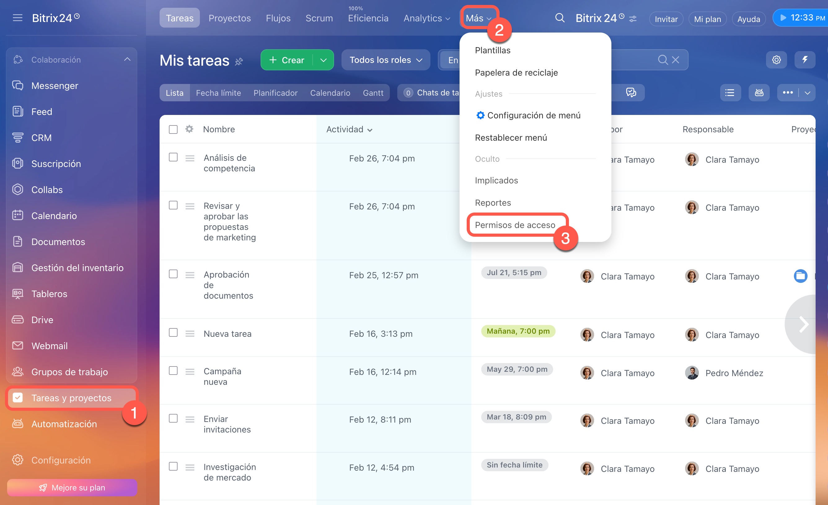 Por defecto, el administrador de Bitrix24 puede configurar los permisos de acceso, pero también puede otorgar estos derechos a otros empleados. Para configurar los permisos, abre Tareas y proyectos > Más > Permisos de acceso.