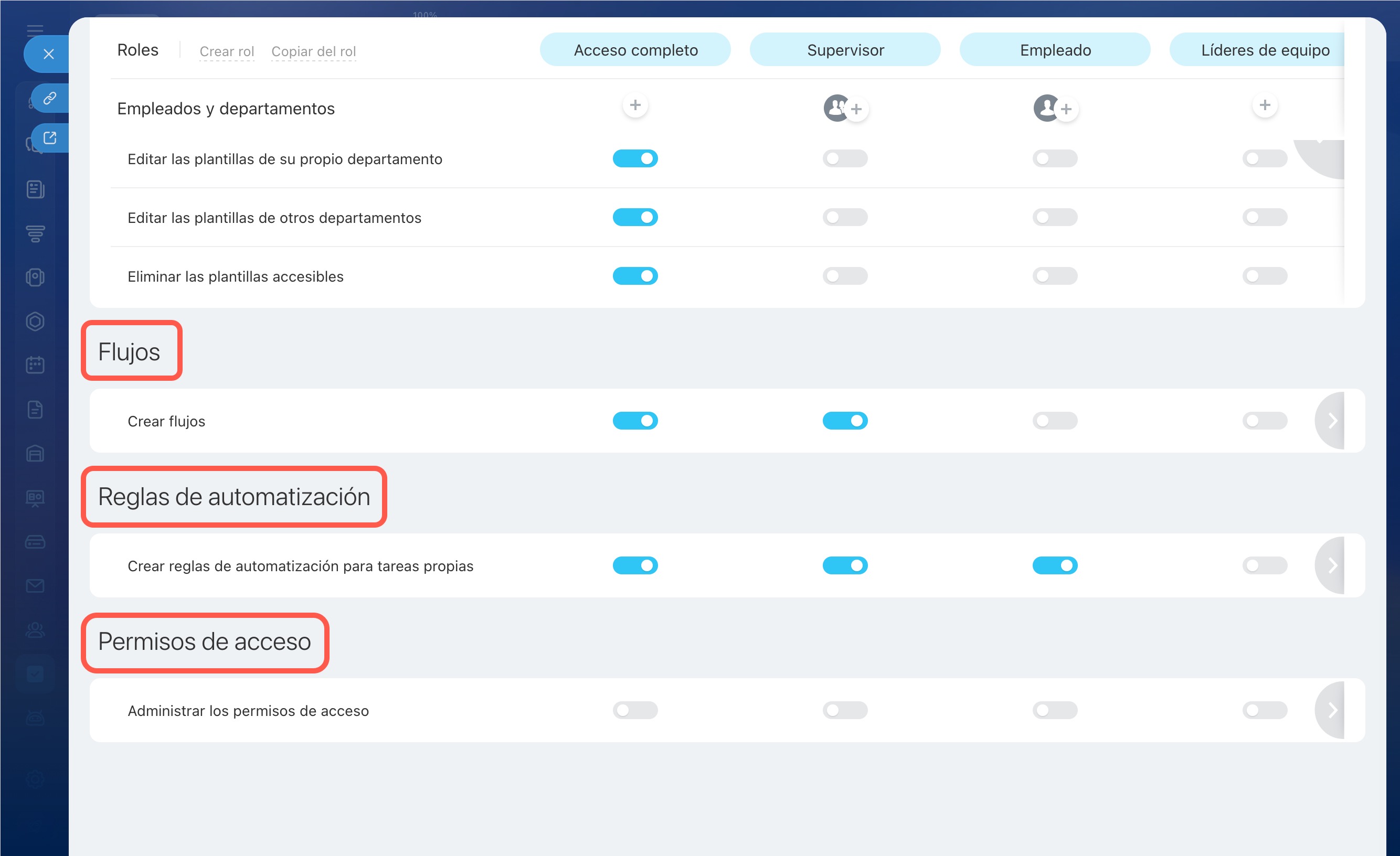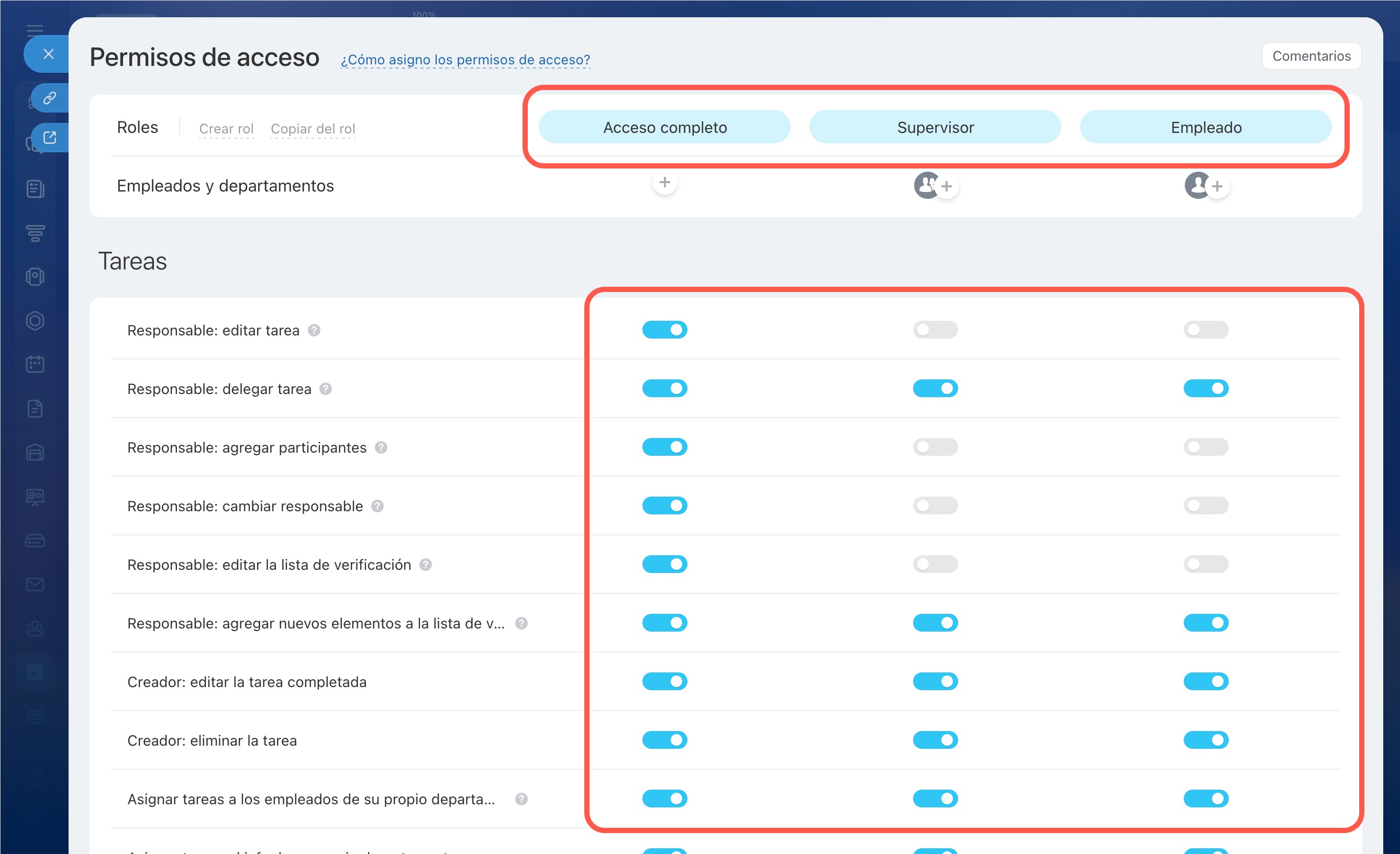 - Por defecto, en la configuración de permisos hay tres roles: Acceso completo, Supervisor y Empleado.