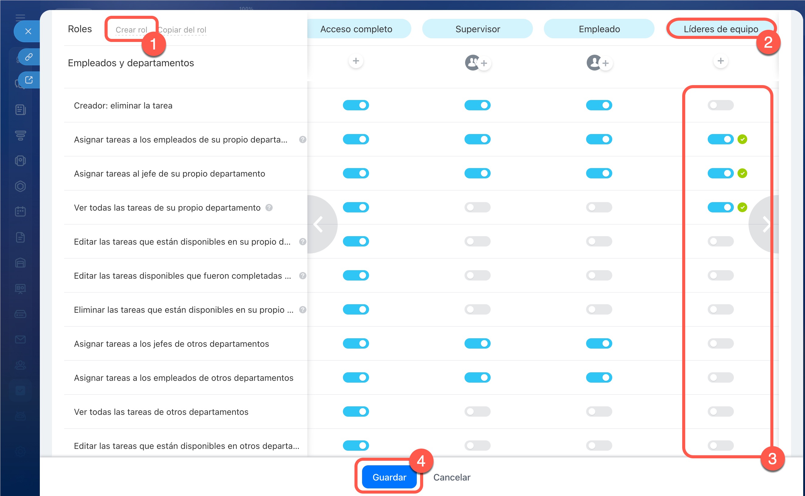 - Editar las tareas que están disponibles en otros departamentos: modificar las tareas de otros departamentos que están disponibles para ver.