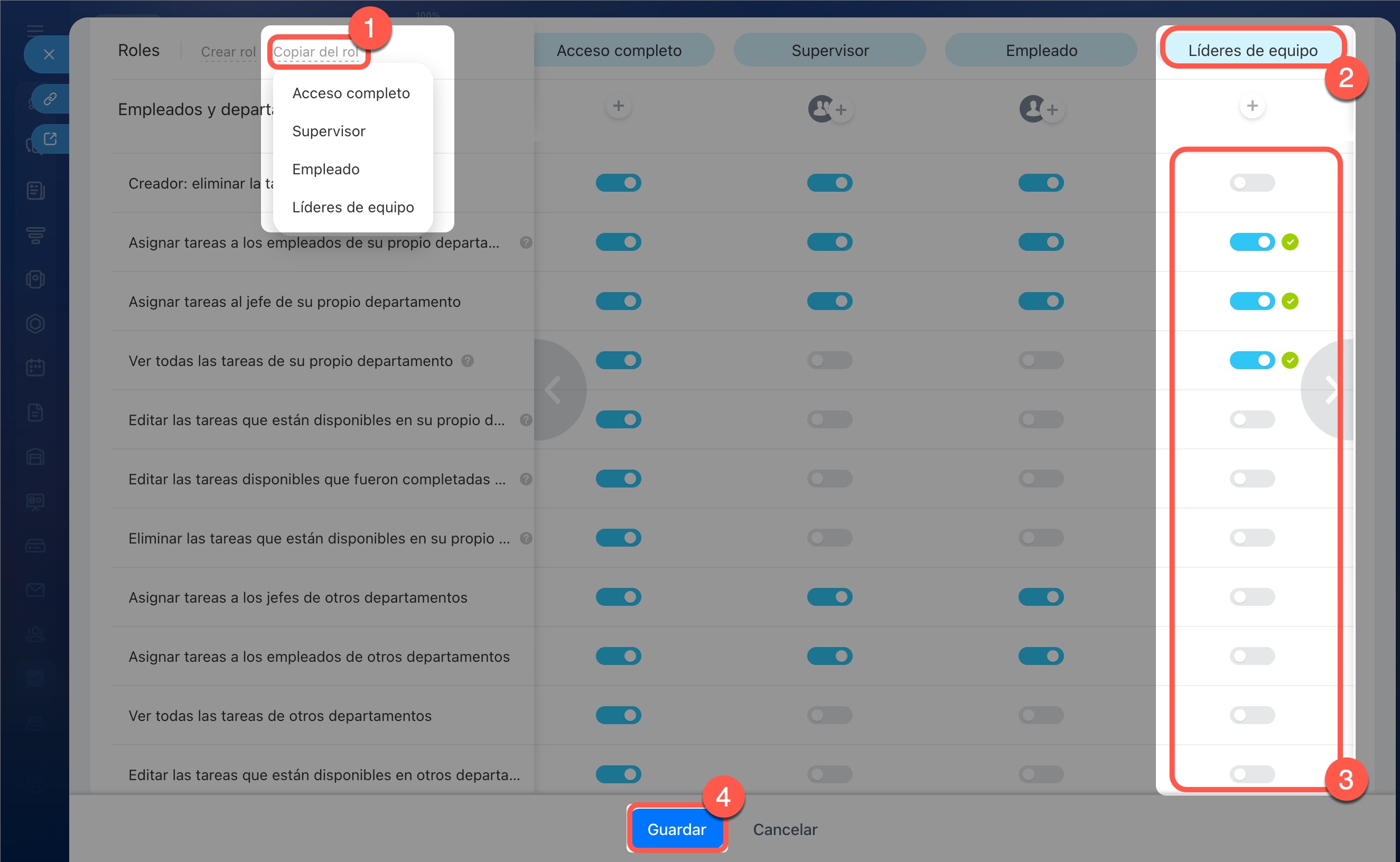 Copiar un rol: esto ayuda a crear un nuevo rol con permisos similares, sin necesidad de configurarlo desde cero.