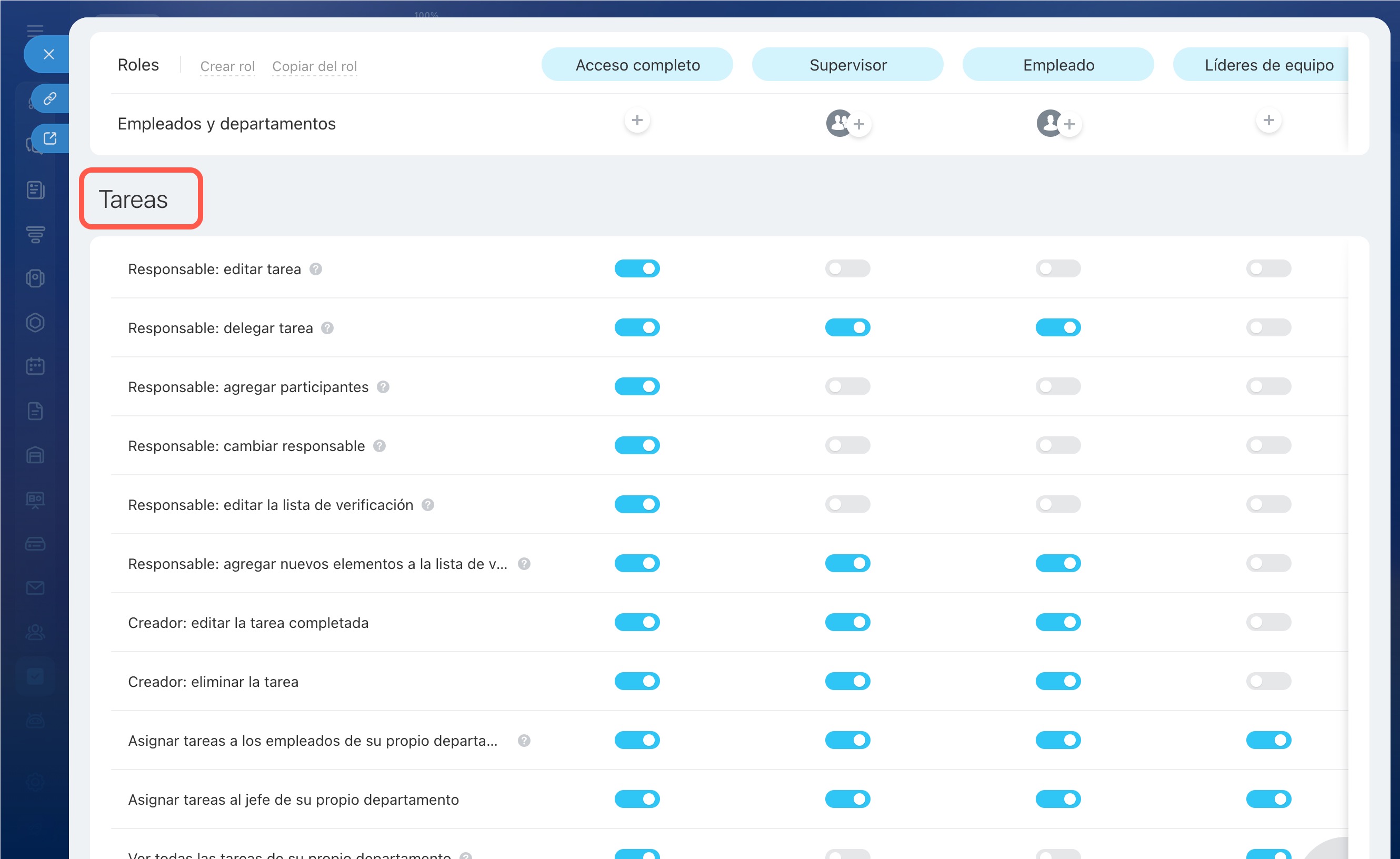 - Supervisor: este rol se asigna automáticamente a los jefes de departamento en la estructura de la compañía. Pueden gestionar las tareas del departamento, pero no pueden configurar roles ni permisos de acceso. Los supervisores siempre ven las tareas de sus subordinados, incluso si este permiso está desactivado en la configuración.