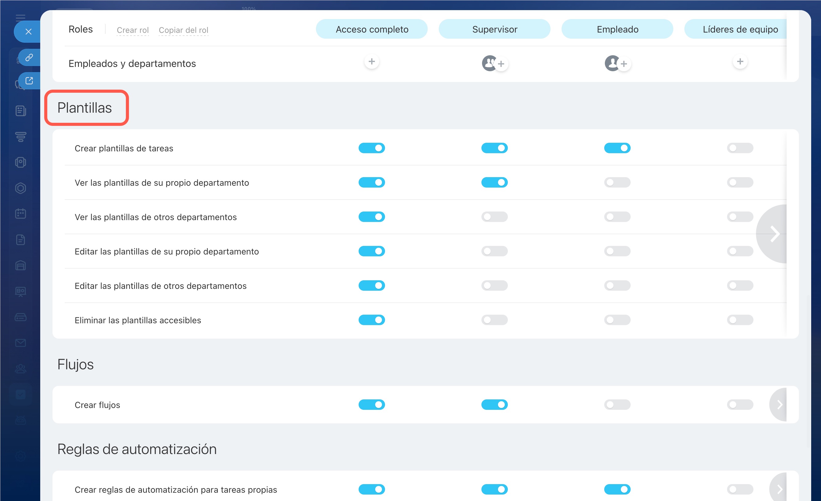 - Empleado: este rol se asigna automáticamente a todos los empleados. Los usuarios trabajan solo con sus propias tareas y no ven las tareas de sus compañeros.