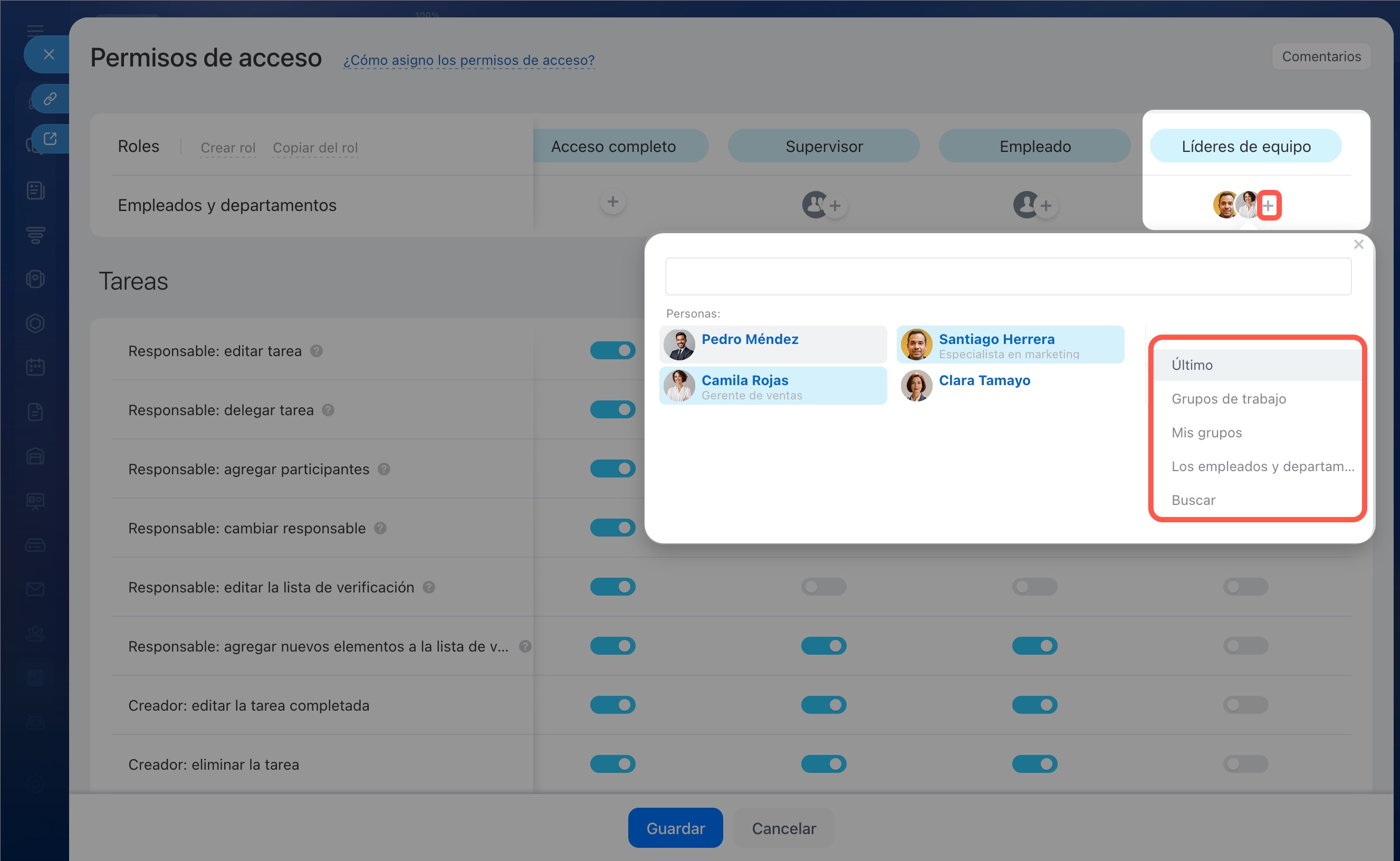 - Agregar participantes: incluir a otros empleados en la tarea. Para esto, se necesita permiso para asignar tareas al empleado seleccionado.