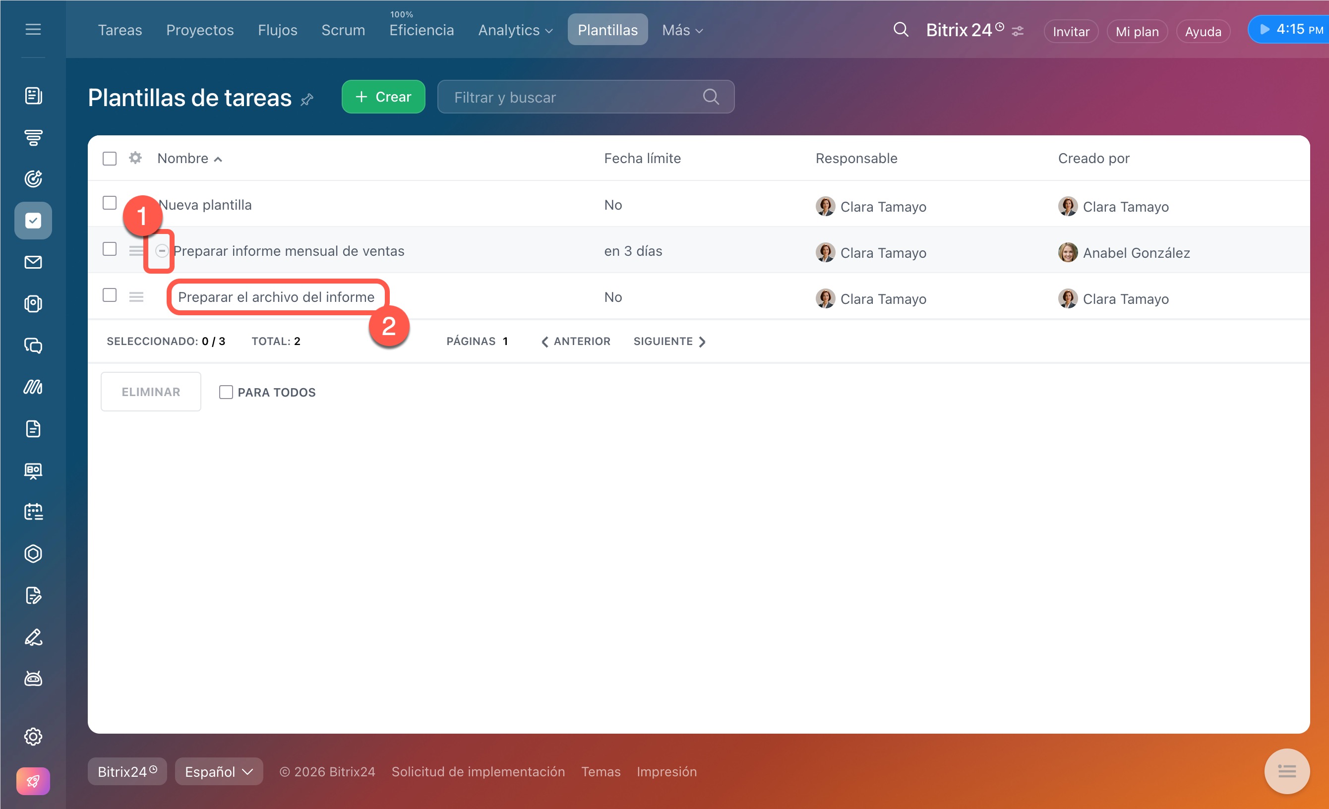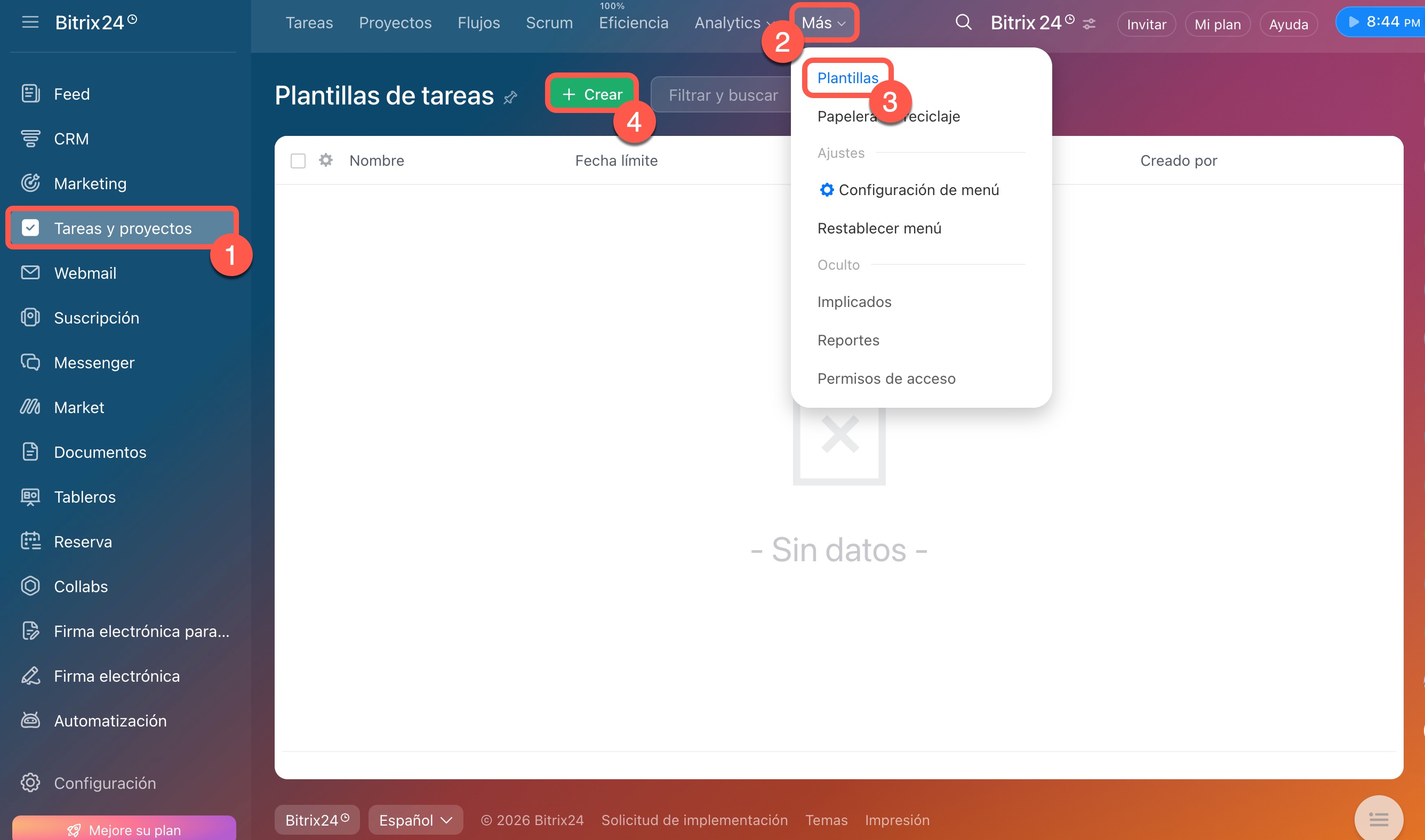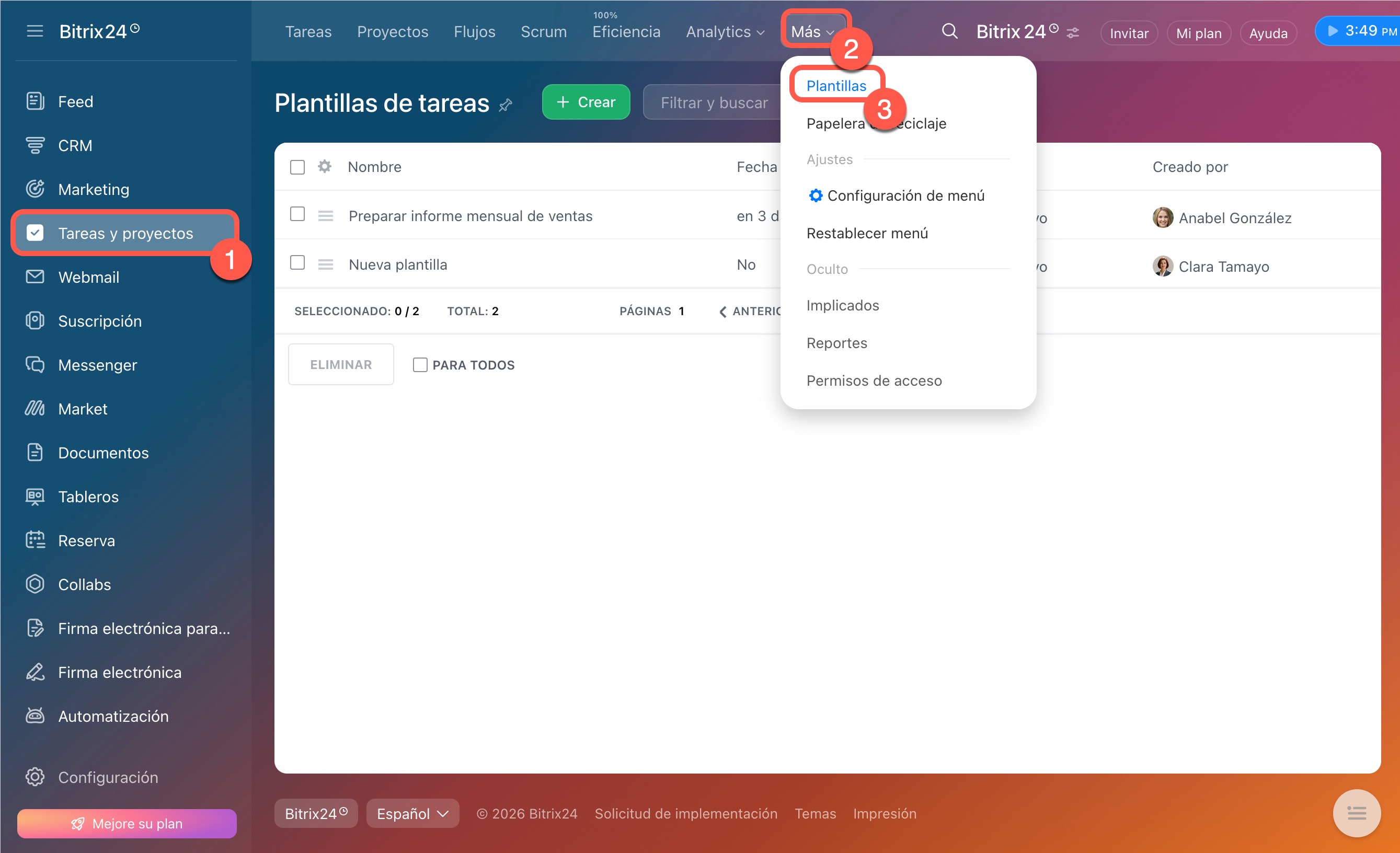 - Puedes crear una plantilla en la sección Tareas y proyectos > Más > Plantillas > Crear.