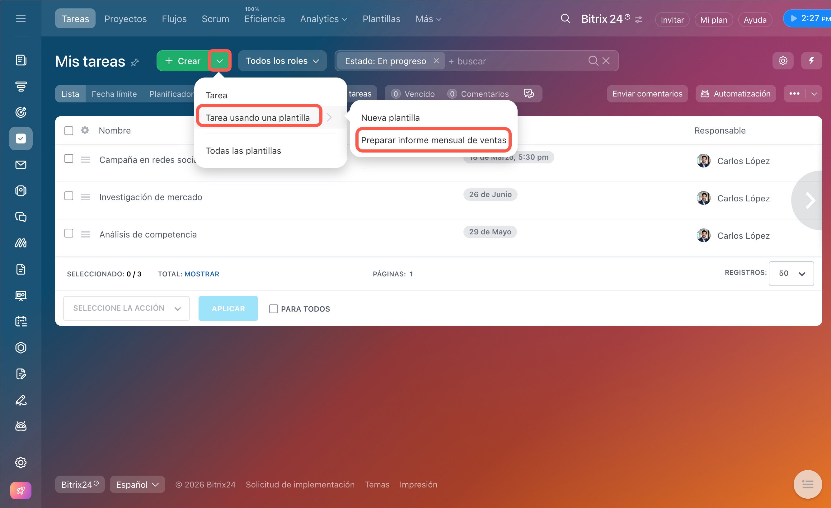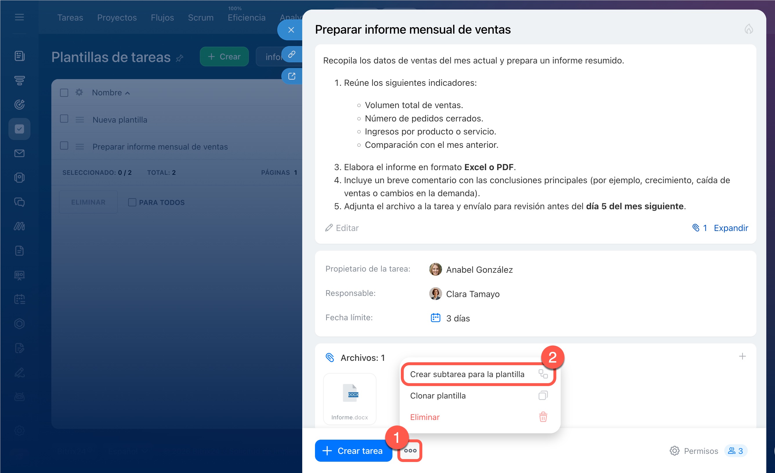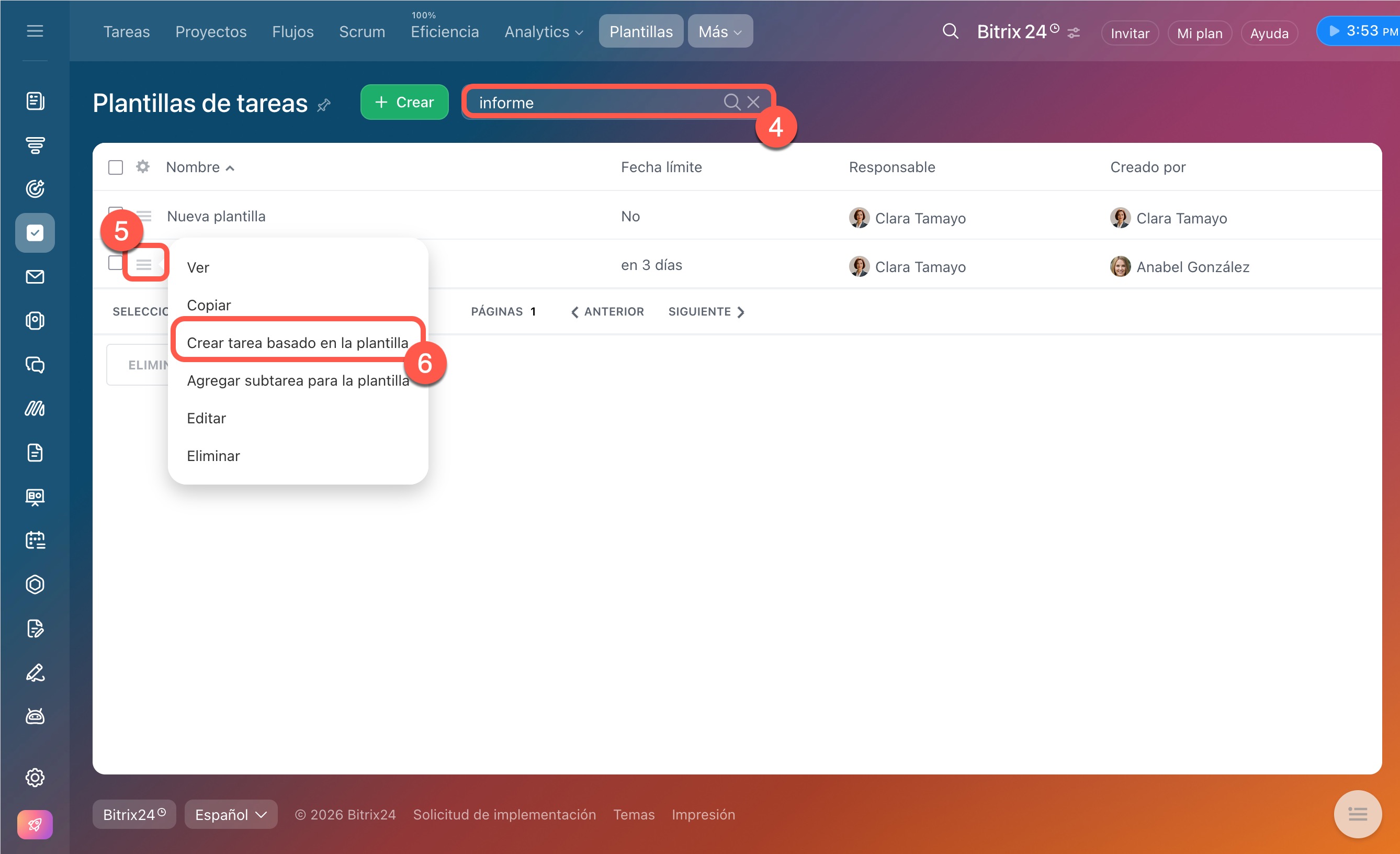 3–4. Junto a la plantilla que necesitas, haz clic en Menú (≡) > Crear tarea basado en la plantilla. En Bitrix24 aparecerá una nueva tarea.